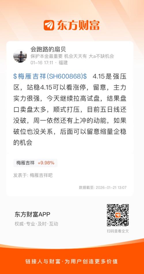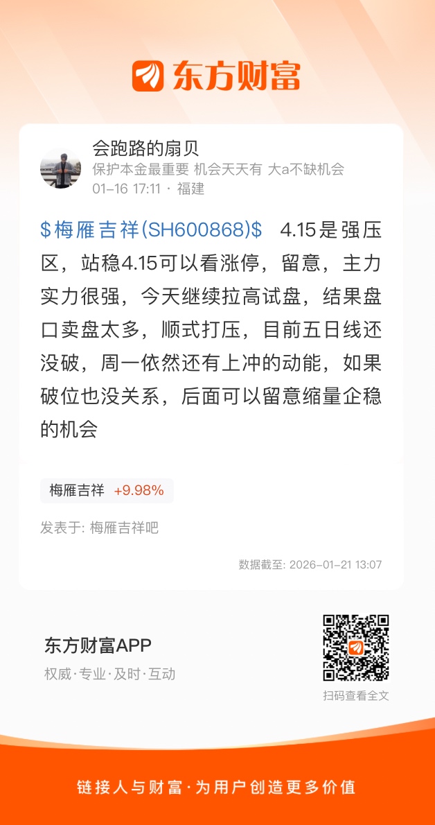 $梅雁吉祥(SH600868)$ 4.15是强压区,站稳4.15可以看涨停,留意,主力实力很强,今天继续拉高试盘,结果盘口卖盘太多,顺式打压,目前五日线还没破,周一依然还有上冲的动能,如果破位也没关系,后面可以留意缩量企稳的机会