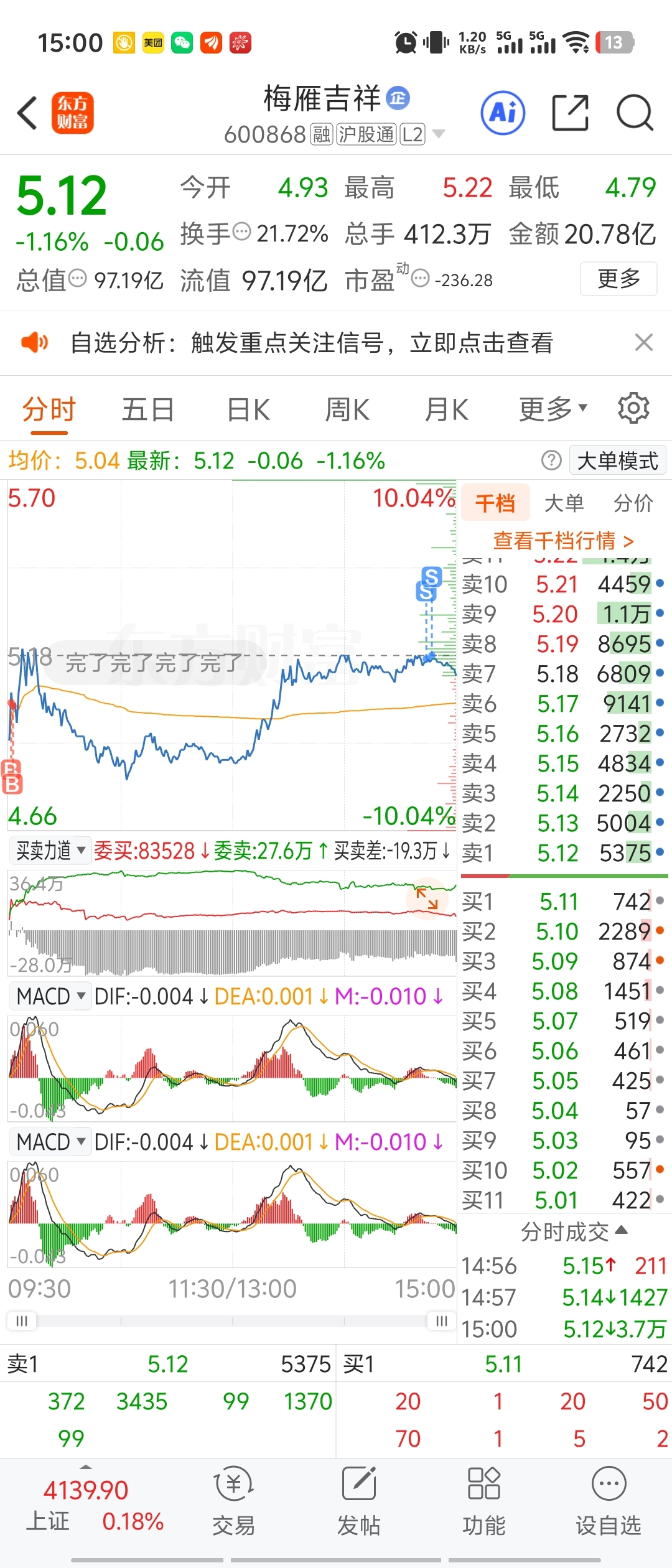 $梅雁吉祥(SH600868)$ 底仓没丢。做个t。明天继续买买买。