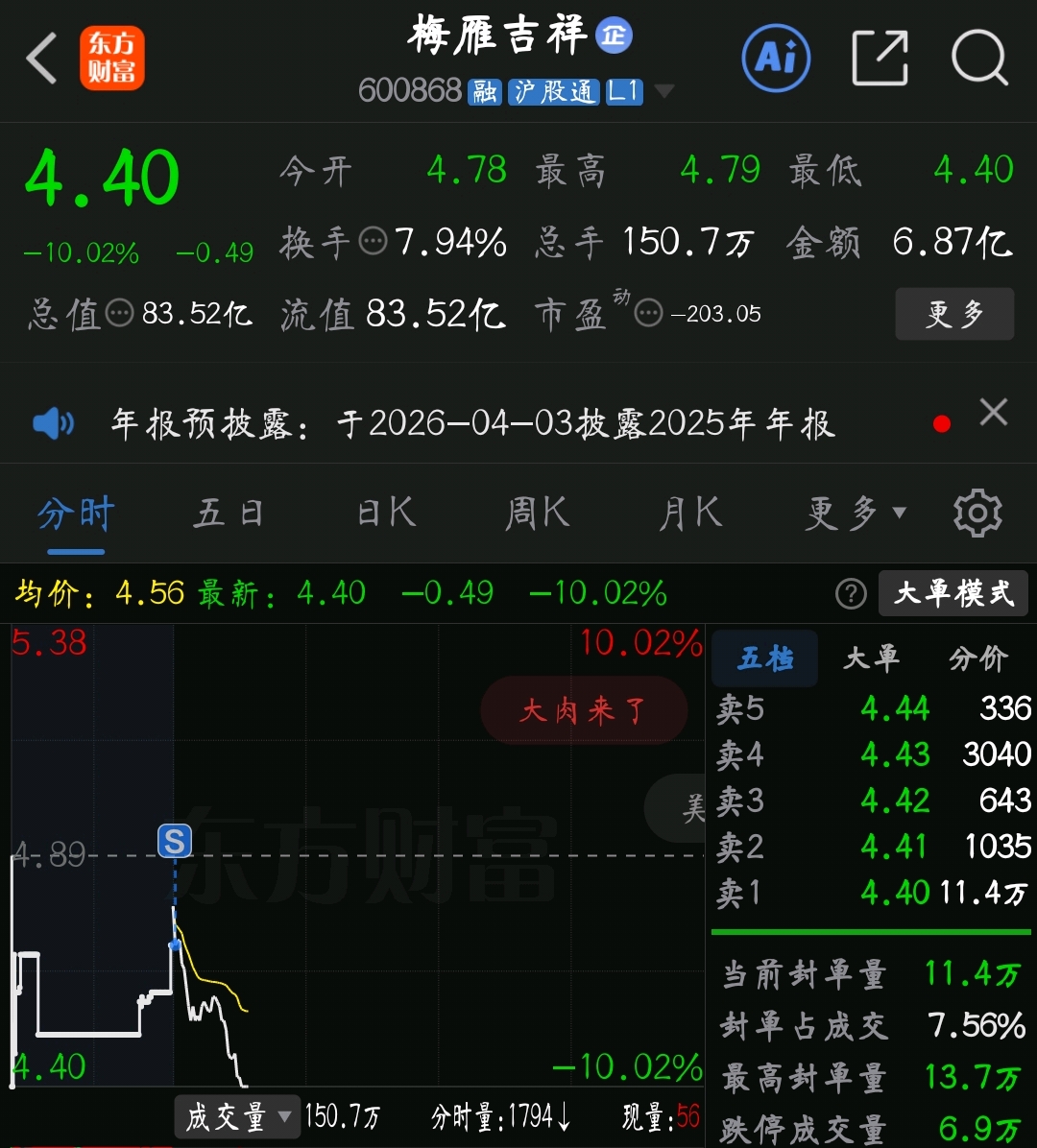 $梅雁吉祥(SH600868)$ 有点惊险啊