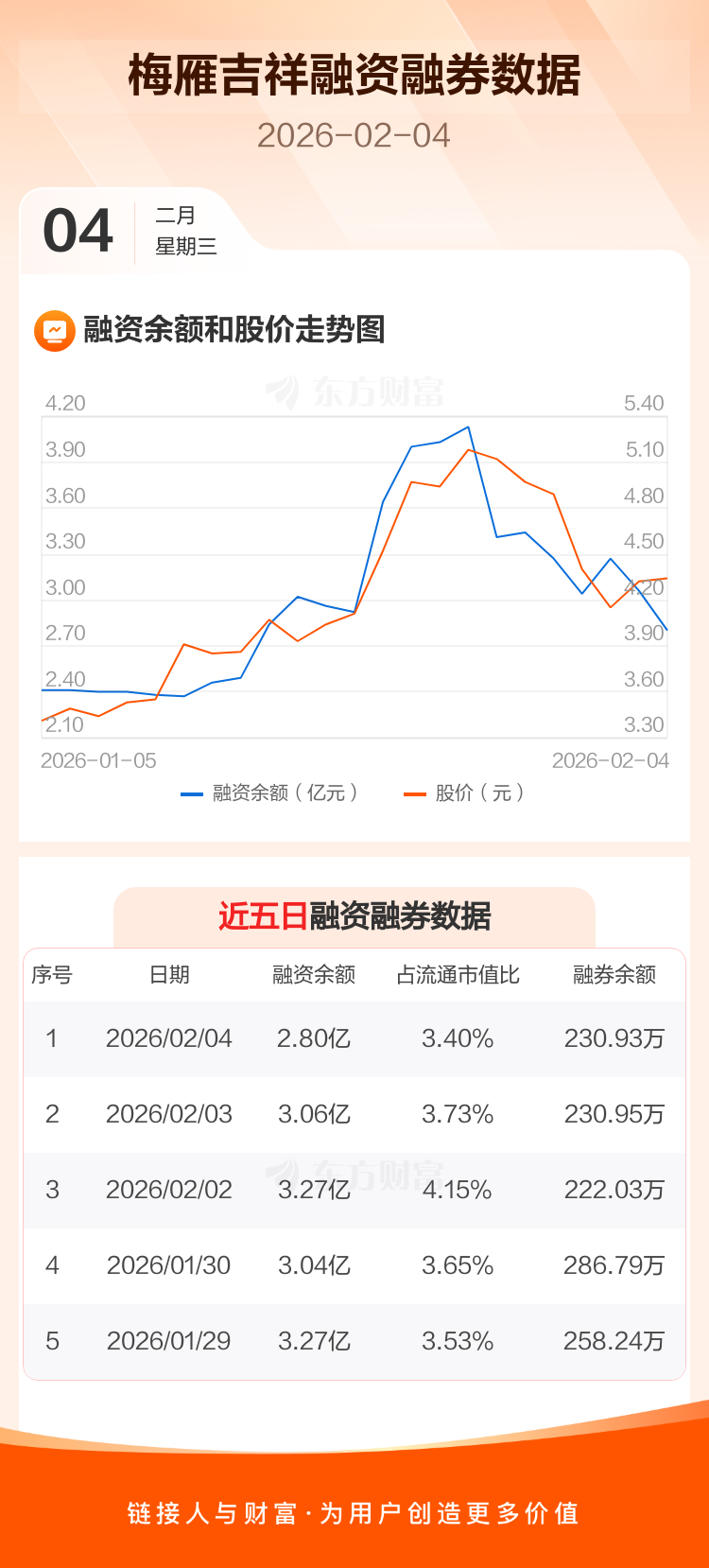 交易所最新数据显示,梅雁吉祥于2026年2月4日获融资买入1976.89万元,融资偿还4553.08万元,当日融资净偿还2576.19万元。目前,该股融资余额2.80亿,占流通市值比例为3.40%。