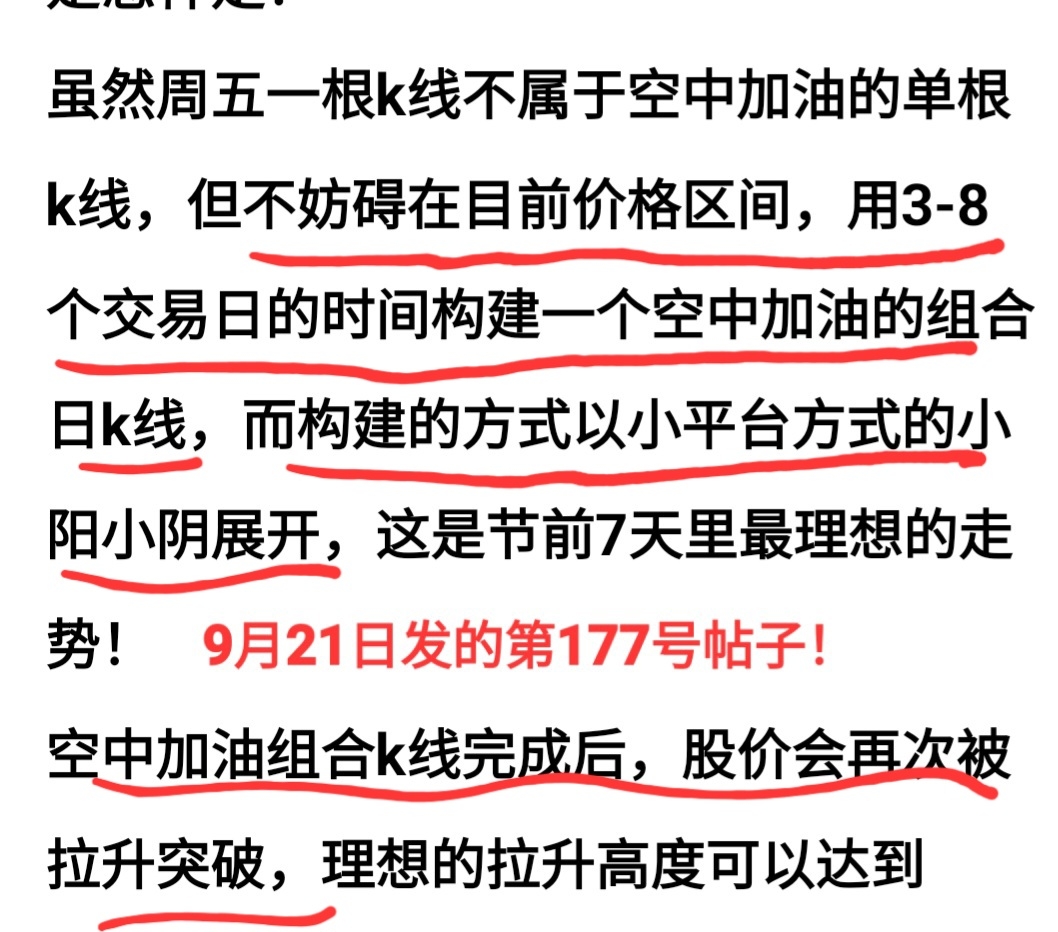 $远东股份(SH600869)$ 昨天股价突破了前高8.59!这是从9月19日那根大阴线后,用了8个交易日完成了空中加油组合k线!我在9月21日的【第177号帖】里曾经明确过:‘’用3-8个交易日的时间构建一个空中加油的组合日k线,而构建的方式以小平台方式的小阳小阴展开。空中加油组合k线完成后,股价会再次被拉升突破‘’。