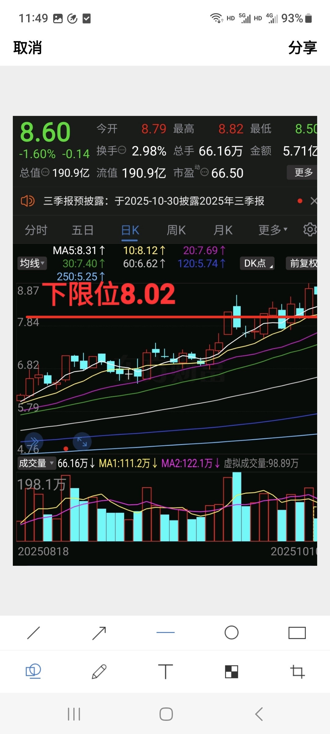 2】如果低开低走,分2种情况:a)低开低走不破8.02,持股不动!b)低开低走破了8 .02,止盈一半出局。您如果目前是追高吃套的,我的建议对您没有参考价值!我的建议只针对在5.50-6.00元之间和我一起建仓的粉丝们有效!
