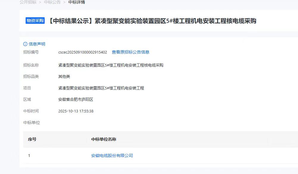 公司中标了合肥best核聚变项目,实锤可控核聚变概念股
