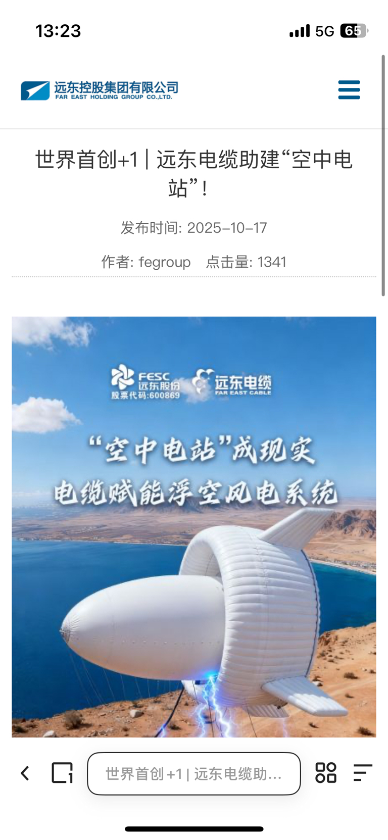 今天有个新闻世界首创空中风力发电,远东的电缆