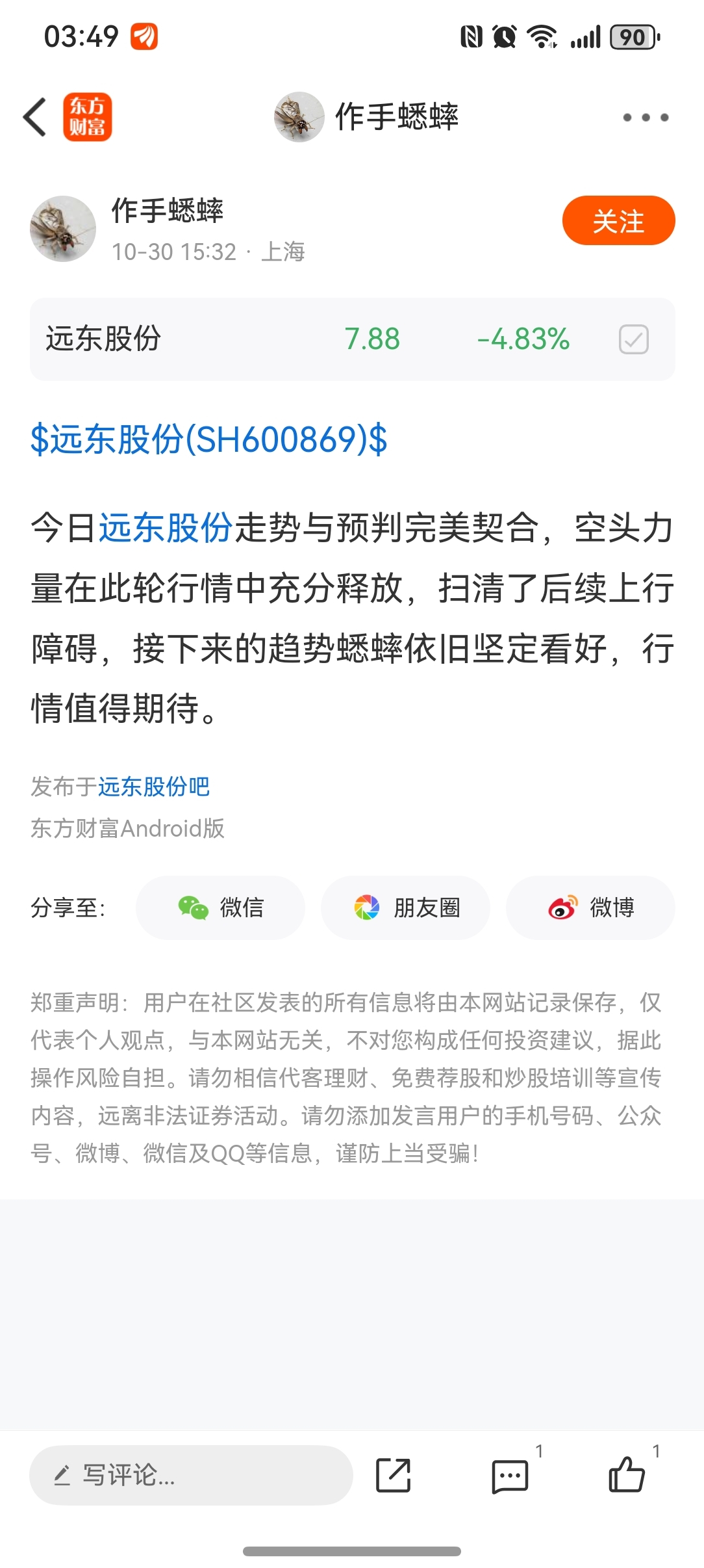 温馨提示: 1.根据《证券法》规定,禁止编造、传播虚假信息或者误导性信息,扰乱证券市场;2.用户在本社区发表的所有资料、言论等仅代表个人观点,与本网站立场无关,不对您构成任何投资建议。用户应基于自己的独立判断,自行决定证券投资并承担相应风险。《东方财富社区管理规定》