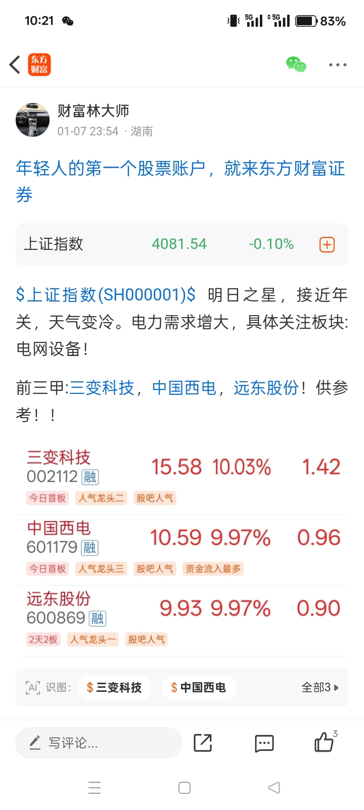 温馨提示: 1.根据《证券法》规定,禁止编造、传播虚假信息或者误导性信息,扰乱证券市场;2.用户在本社区发表的所有资料、言论等仅代表个人观点,与本网站立场无关,不对您构成任何投资建议。用户应基于自己的独立判断,自行决定证券投资并承担相应风险。《东方财富社区管理规定》