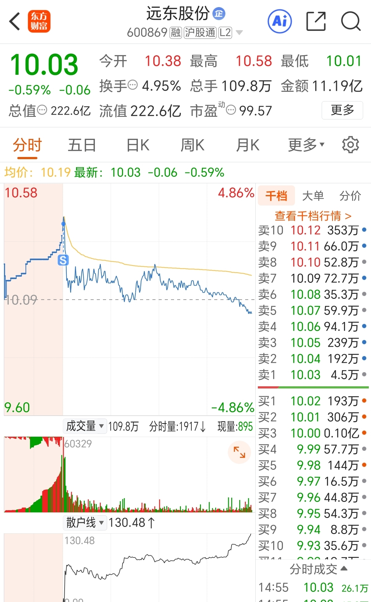 $远东股份(SH600869)$ 你们猜我早上挂单10.01接回来接了没?哈哈别猜了,我不接,原因是上午收盘没翻红,下午开盘就砸,果断撤单,一点儿不给主力套我的就会