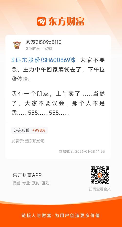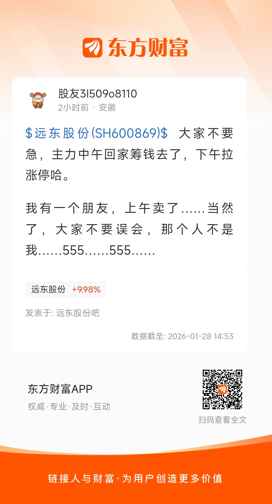 $远东股份(SH600869)$ 大家不要急,主力中午回家筹钱去了,下午拉涨停哈。