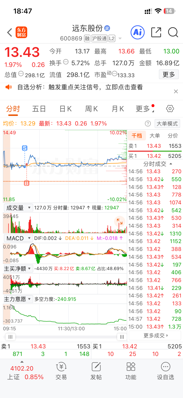$远东股份(SH600869)$ 当我卖出的一瞬间我就有强烈的卖飞感觉,然后就做了sb