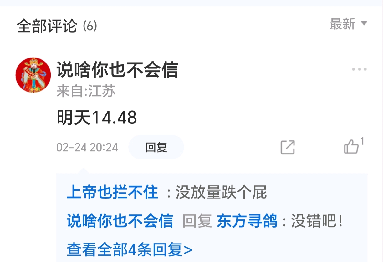 温馨提示: 1.根据《证券法》规定,禁止编造、传播虚假信息或者误导性信息,扰乱证券市场;2.用户在本社区发表的所有资料、言论等仅代表个人观点,与本网站立场无关,不对您构成任何投资建议。用户应基于自己的独立判断,自行决定证券投资并承担相应风险。《东方财富社区管理规定》