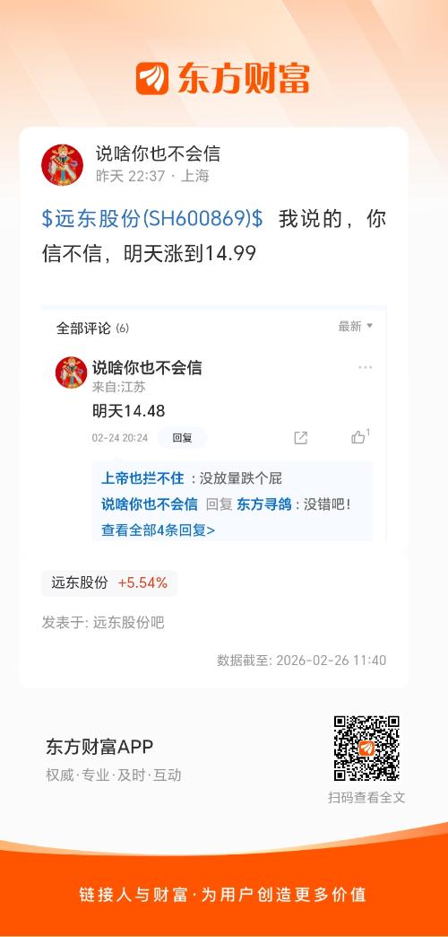 $远东股份(SH600869)$  我说的,你信不信,明天涨到14.99