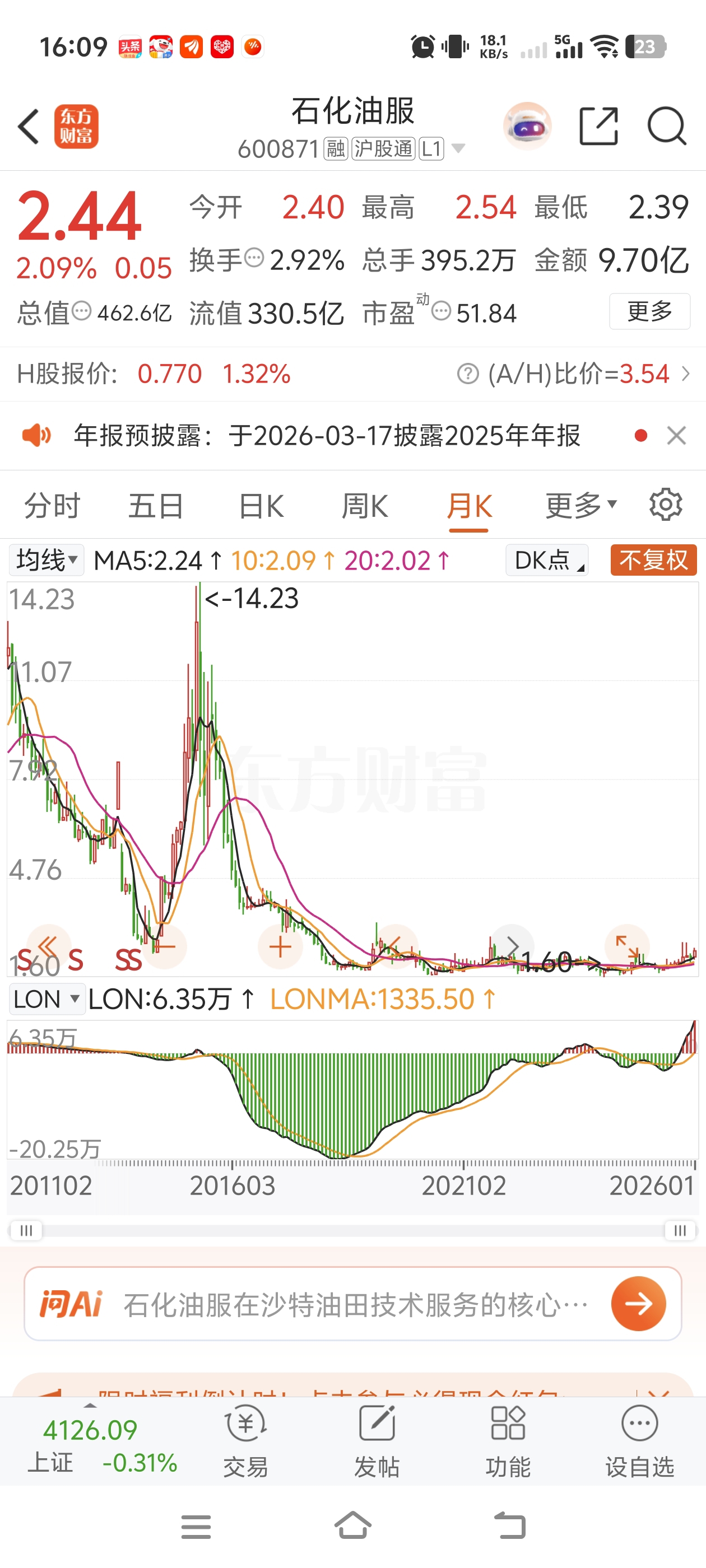 喜欢做超长线慢牛,不看盘不盯盘。想等几个月之后直接收米的,可以关注石化油服了。至于仓位,会做短线的八成仓,留两成仓做短线。不会做短线的就ALL IN放到那里不动。两块五以下只加仓不减仓。