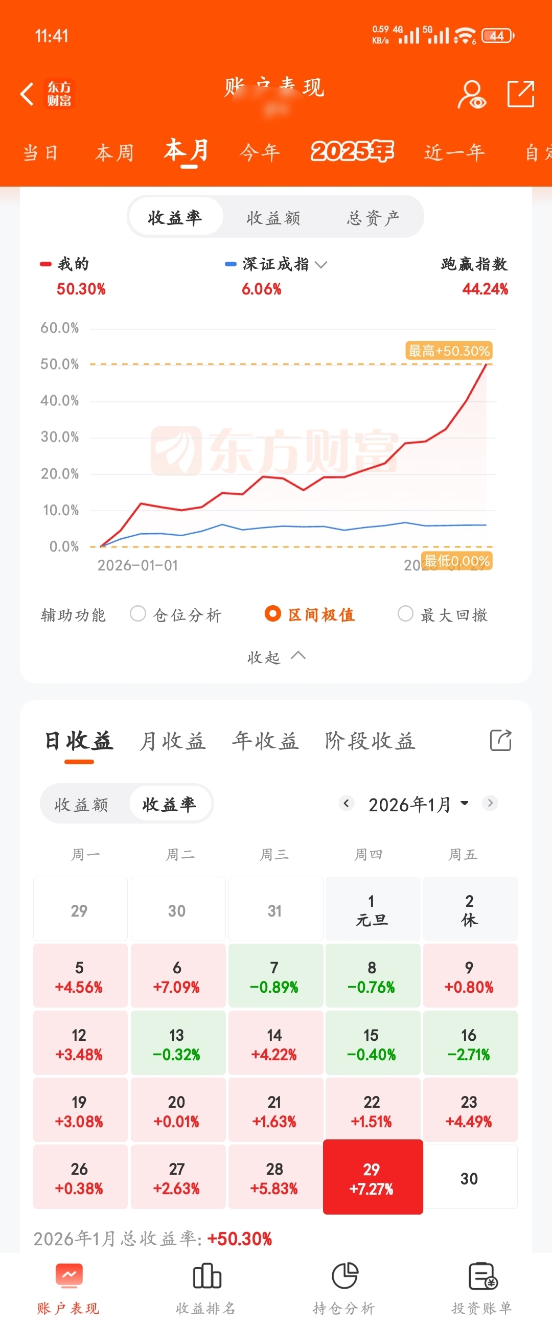 早盘急跌调仓,上午收盘盈利7.27%,月收益50.3%。希望下午收盘能守住今天收