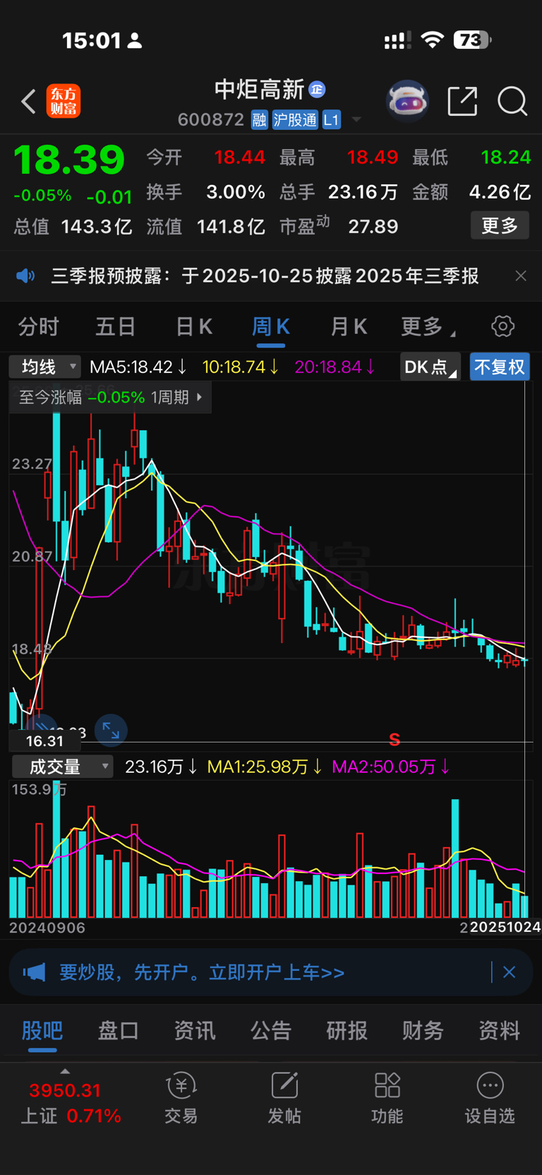 $中炬高新(SH600872)$ 周振幅,一分,哈哈哈。今天成交量又缩量,好一个缩量下跌。。。师叔又亏了1800大洋。。。。哈哈哈,放眼量,需向前看。