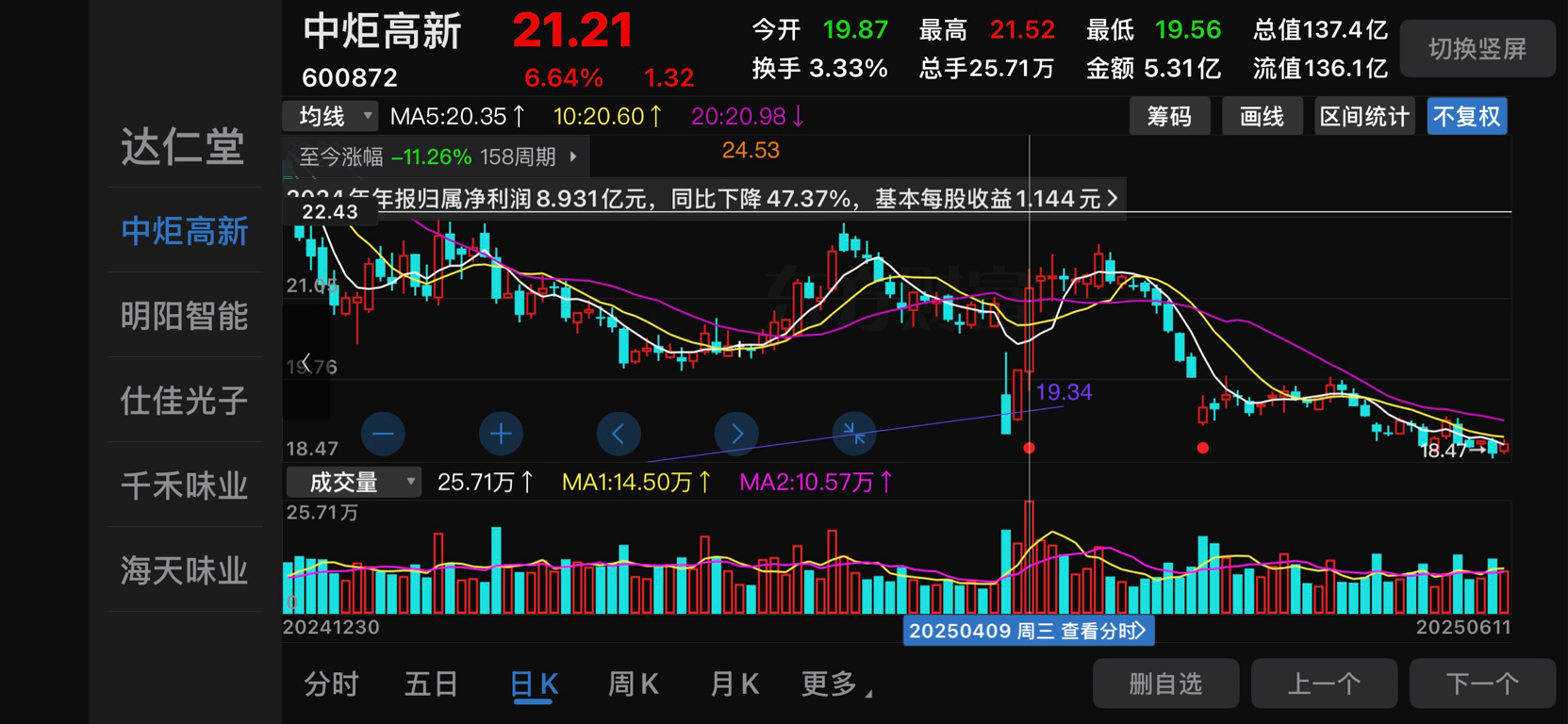 $中炬高新(SH600872)$ 师叔又亏了哈哈。近一年的振幅和量能都在极度萎缩。。。。潜台词是啥。。。哈哈哈。最高涨幅,单日6个点今年4月9号。第二高是单日5个点今年6月12日。