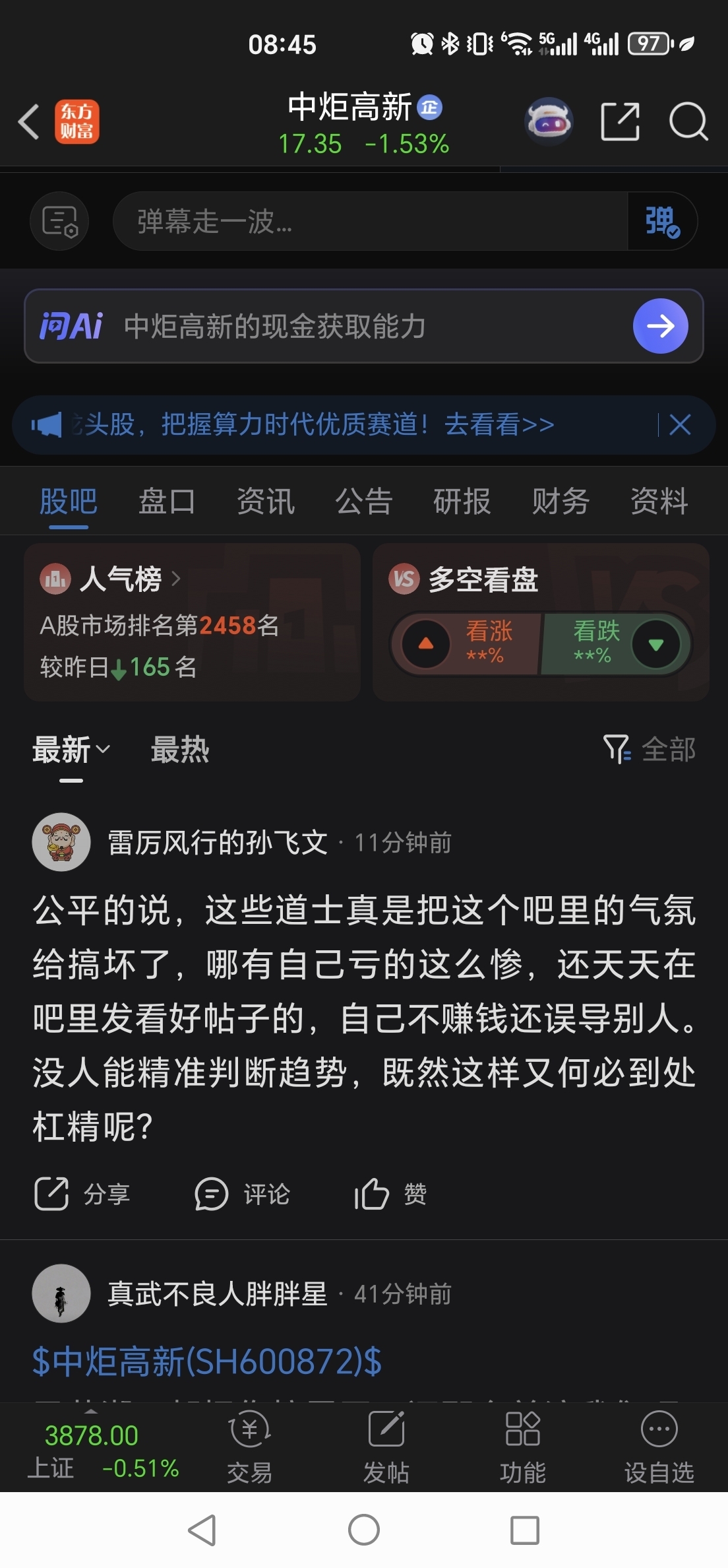 $中炬高新(SH600872)$ 公平的讲,掌门在这里待了四年有余,用自己的实际行动践行者自己的承诺,高位提示减持,低位提示坚守。你赔钱,我们也在赔钱,但是在情绪管理方面,你们控制的一塌糊涂,这也充分说明了你们队这只股票研究的不够透彻,因为无知,所以害怕,再加上自己赔钱,就把自己的坏情绪发泄到我们身上。抱歉,我们不是你们发泄情绪的地方,也不是杠精,谁惹我们,我们仅仅反击而已,还未主动出击呢。