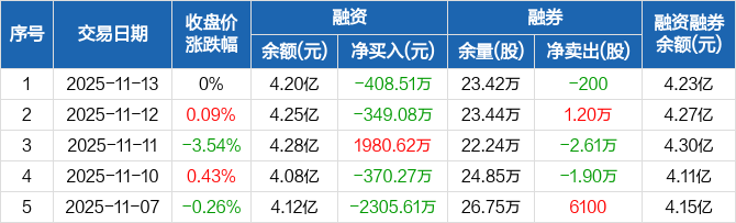 梅花生物:融资净偿还408.51万元,融资余额4.2亿元(11-13)
