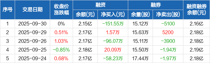 创业环保:融资净偿还151.55万元,融资余额2.15亿元(09-30)