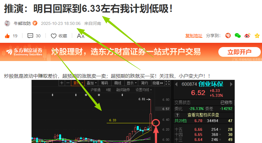 这个推演的精准吧,大盘涨它逆着大盘下跌到我的推演的低吸位置6.33左右;上周五低吸,今天周一拉升获利出来,短线一进一出2.6%左右到手!做短线个股就是这样,平时小涨小赚,偶尔碰到热点就大涨大赚!关注,小户变大户,大家一起来致富!