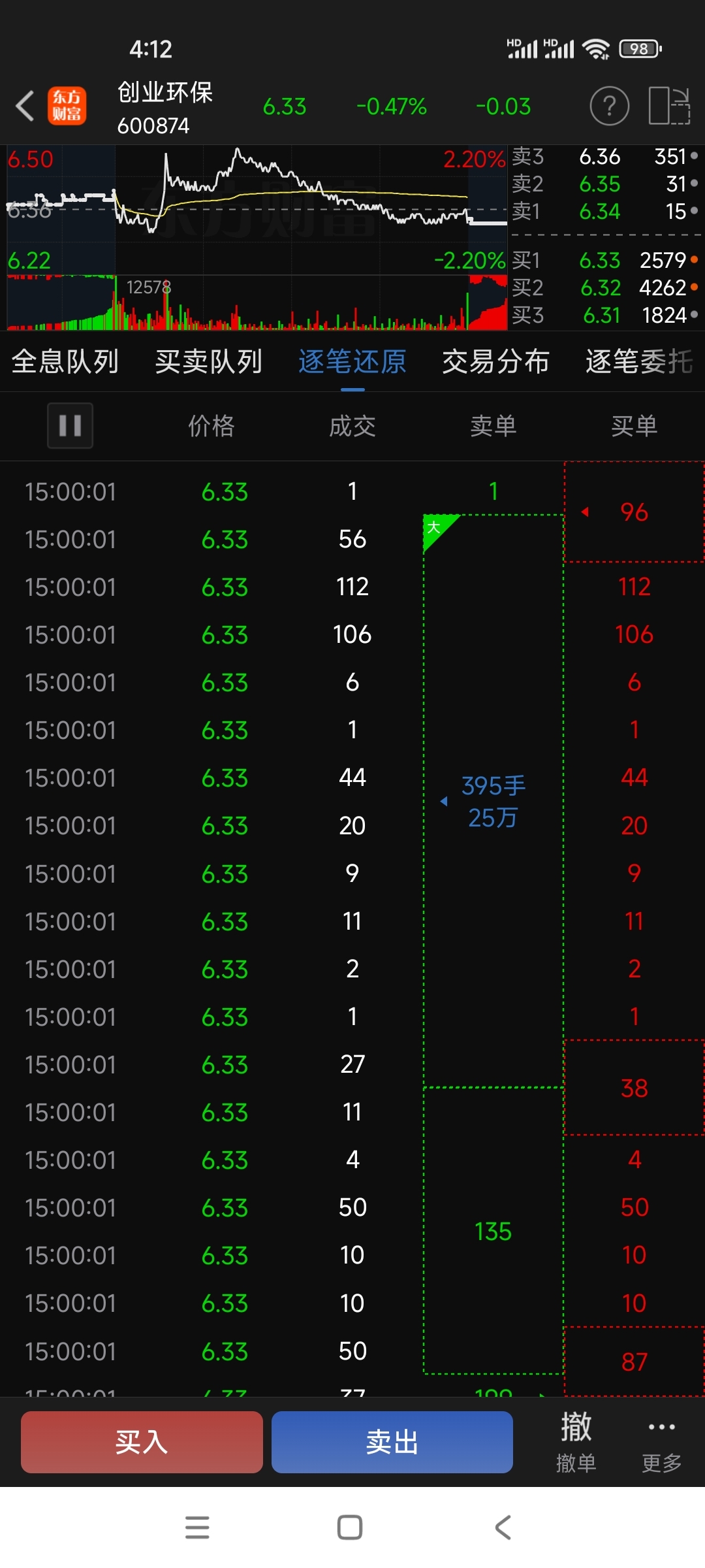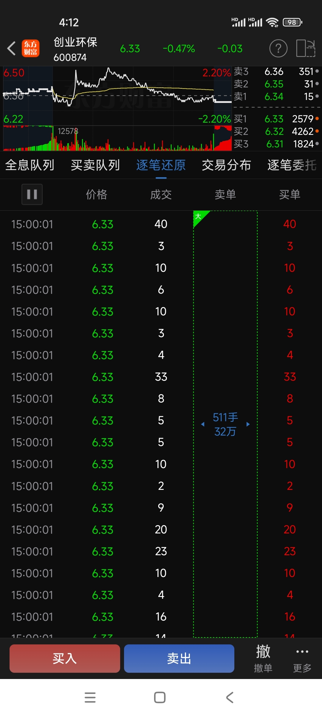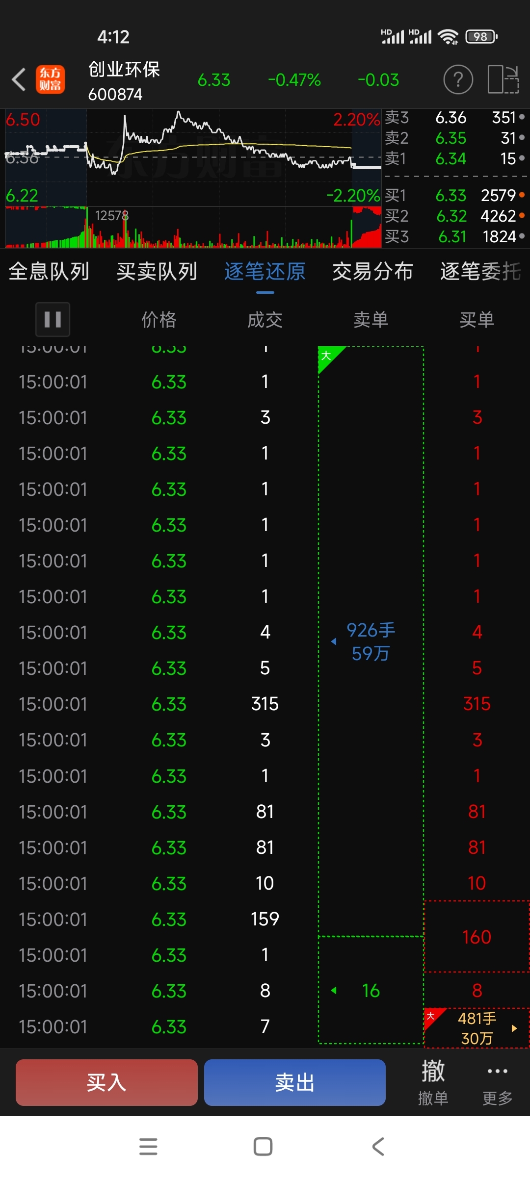 $创业环保(SH600874)$ 尾盘集合竞价这个短线柚子还在卖出