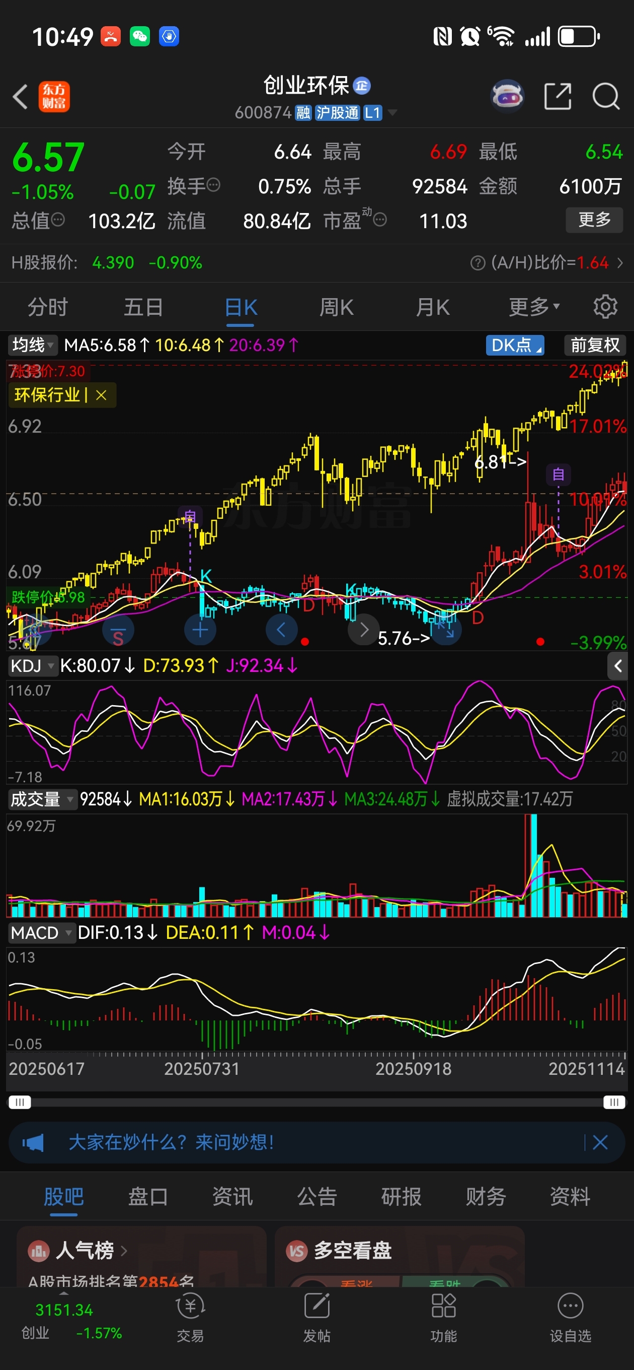 $创业环保(SH600874)$ 垫底货