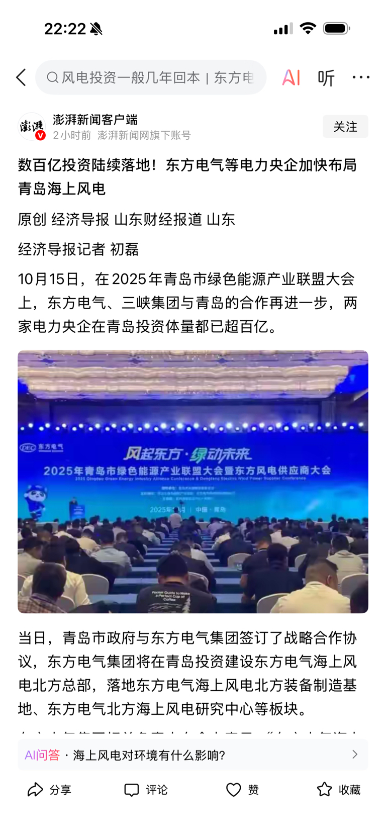 $东方电气(SH600875)$ 全球最大海上风电机组只有东方电气能造...