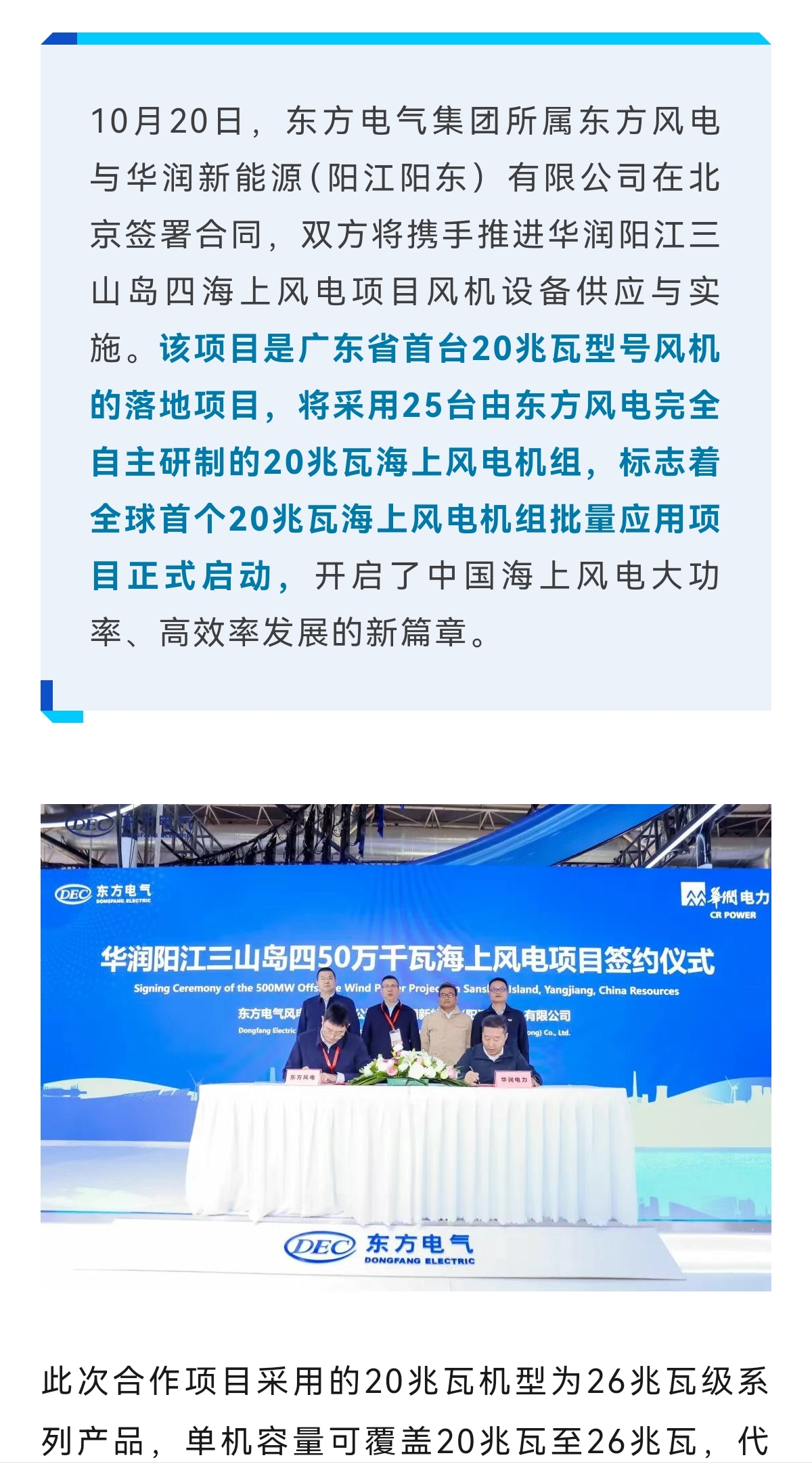 $东方电气(SH600875)$ 10月20日,东方电气集团所属东方风电与华润新能源(阳江阳东)有限公司在北京签署合同,双方将携手推进华润阳江三山岛四海上风电项目风机设备供应与实施。该项目是广东省首台20兆瓦型号风机的落地项目,将采用25台由东方风电完全自主研制的20兆瓦海上风电机组,标志着全球首个20兆瓦海上风电机组批量应用项目正式启动,开启了中国海上风电大功率、高效率发展的新篇章。