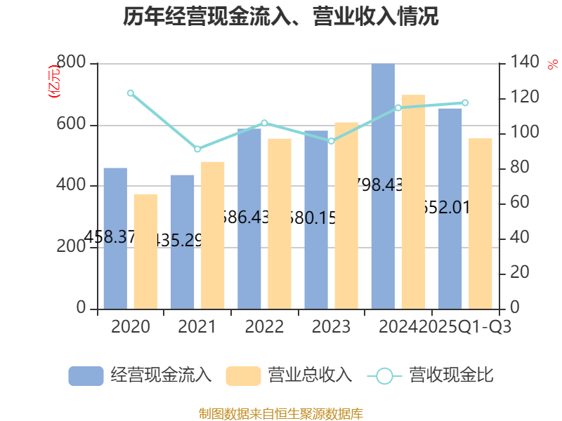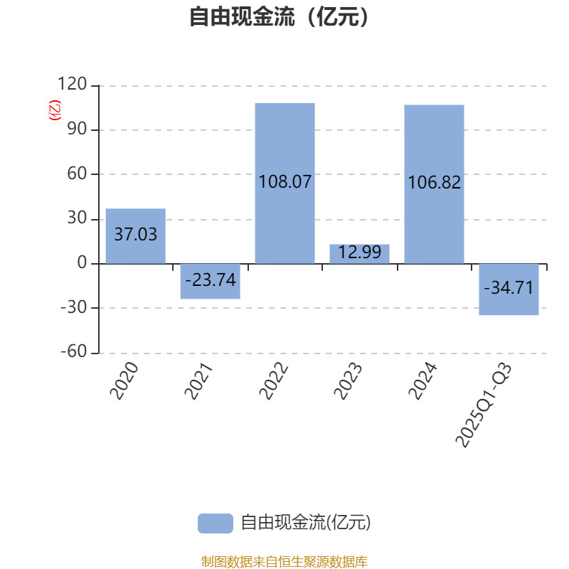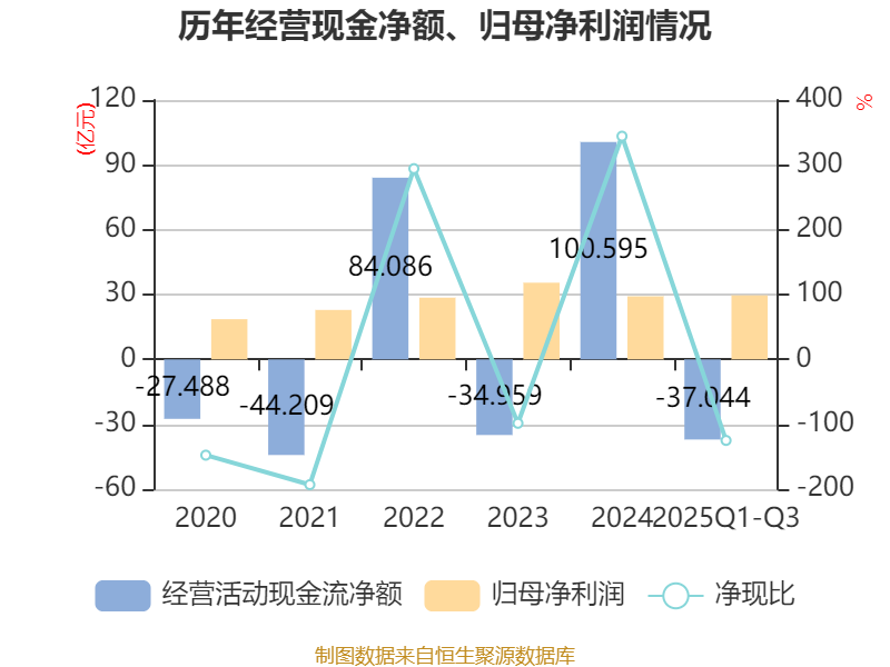 2025年前三季度,公司经营活动现金流净额为-37.04亿元,同比减少97.48亿元;筹资活动现金流净额70.71亿元,同比增加69.03亿元;投资活动现金流净额-18.29亿元,上年同期为-95.24亿元。