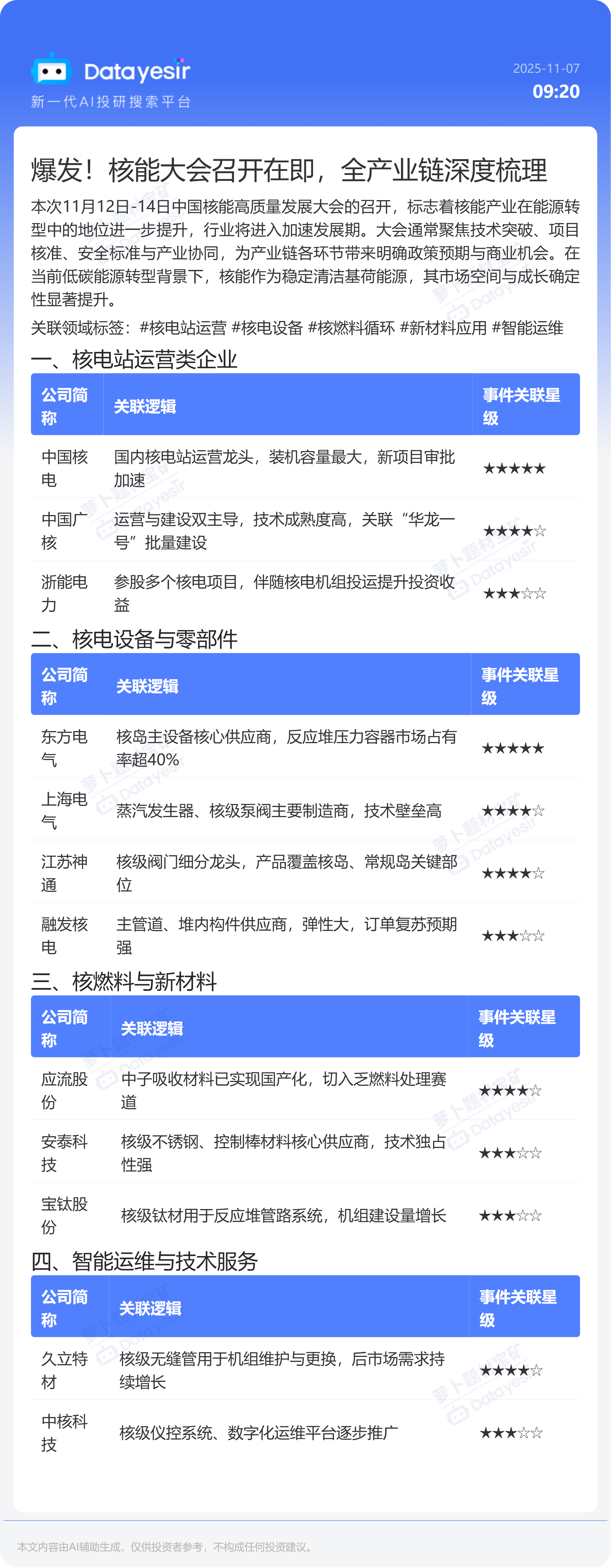 本次11月12日-14日中国核能高质量发展大会的召开,标志着核能产业在能源转型中的地位进一步提升,行业将进入加速发展期。大会通常聚焦技术突破、项目核准、安全标准与产业协同,为产业链各环节带来明确政策预期与商业机会。