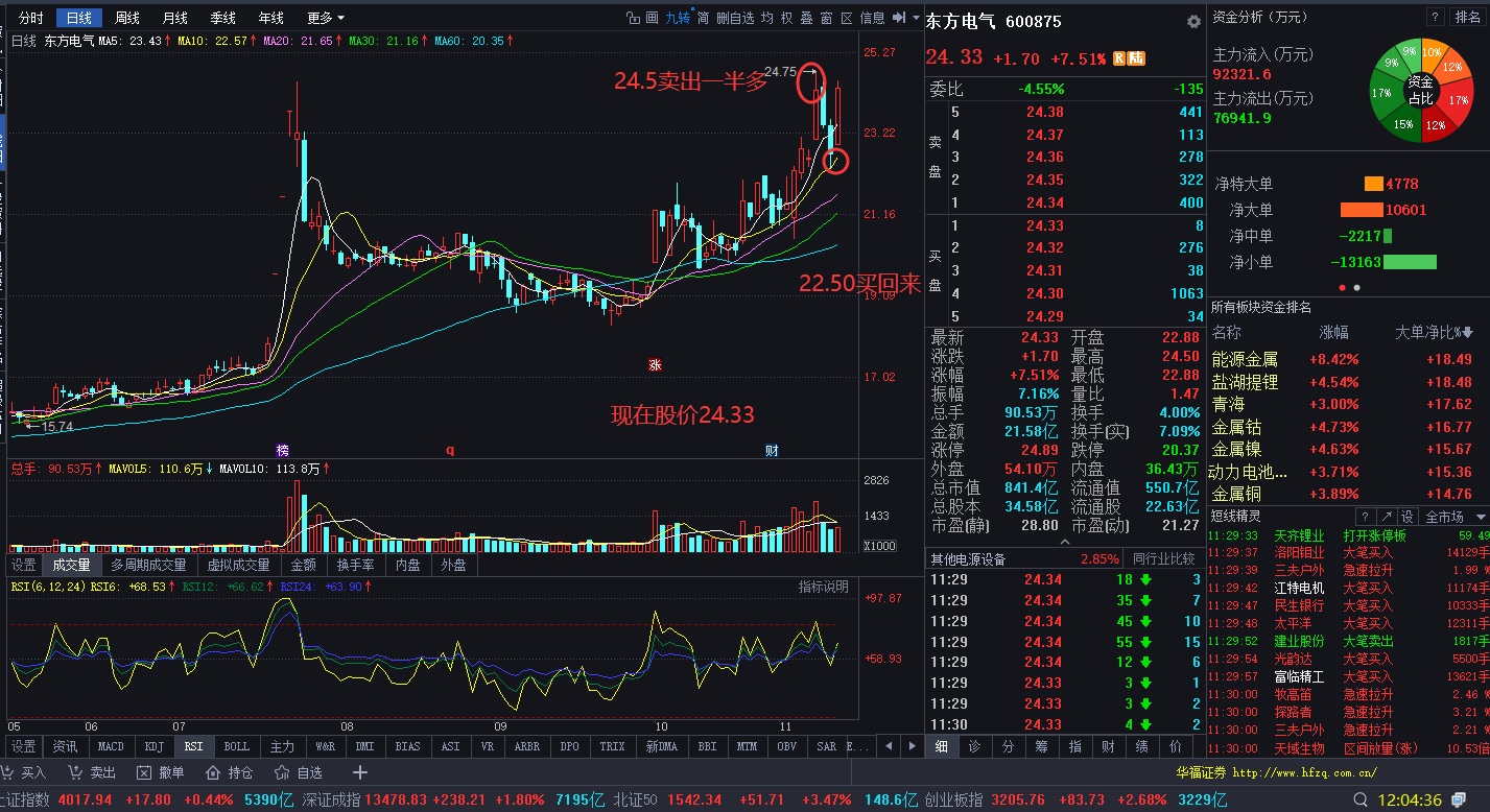 这一波对东方电气高抛低吸接近完美~周一24.5卖出一半多,周三22.5元买回来,周四现在24.33元!感悟:炒股有快乐的时候,也有操作失误悔到肠子青的时候!