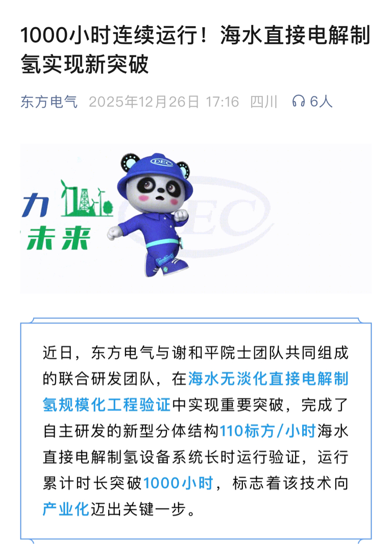 $东方电气(SH600875)$ 中国东方电气于谢院士 海水无淡化制氢发展史