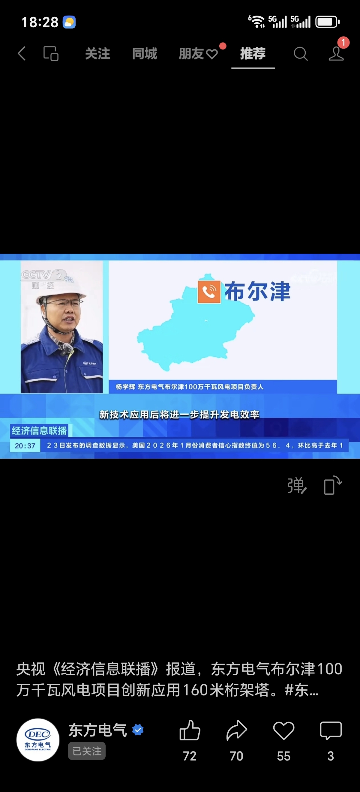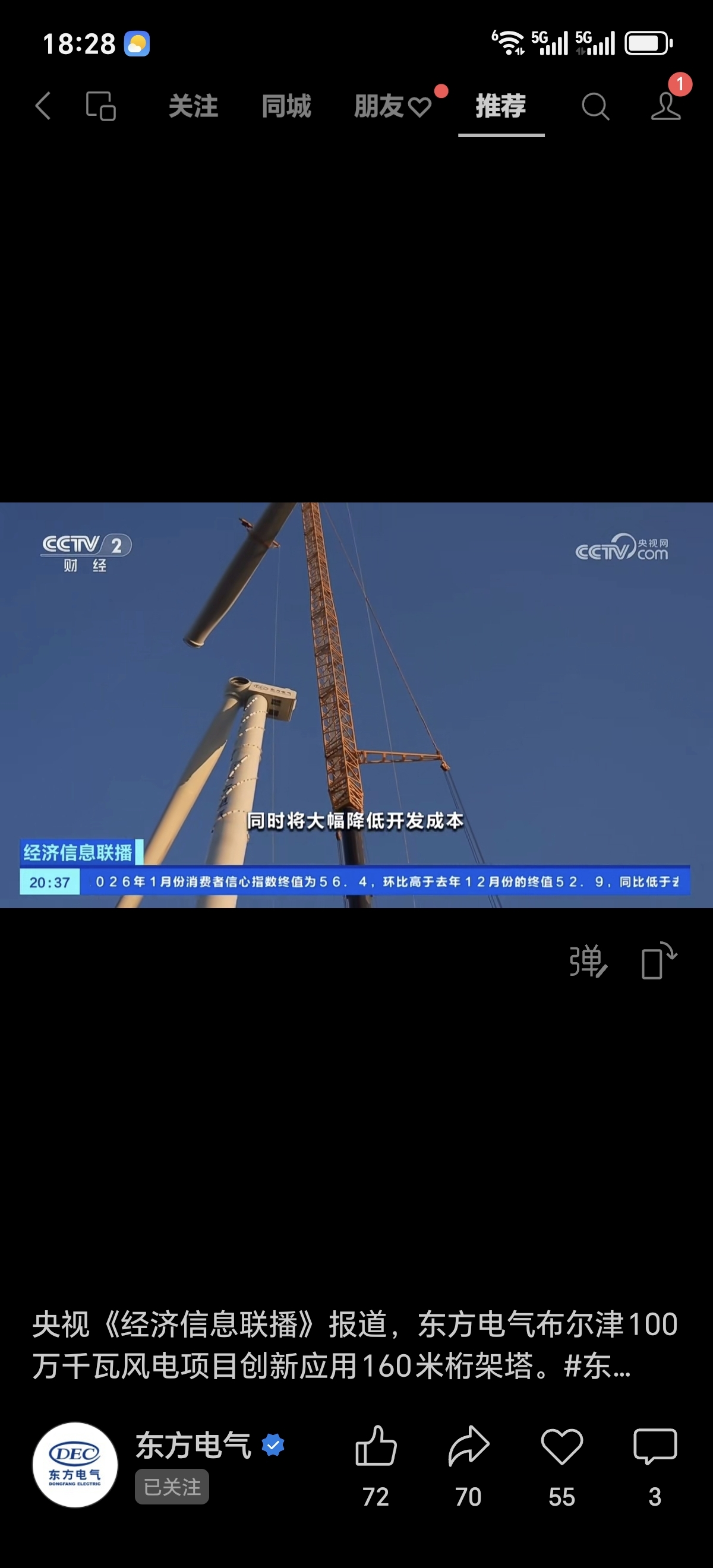 央视《经济信息联播》报道,东方电气布尔津100万千瓦风电项目创新应用160米桁架
