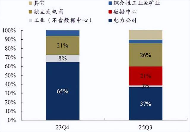 但站在眼下,据笔者观察,最重要的需求驱动因素还是AI电力需求。人工智能数据中心(AIDC)建设加速带来大量电力需求,燃气轮机行业有望开启新一轮上行周期。数据最能说明问题,从订单客户结构看,AIDC在燃气轮机中的占比提升明显,由2023Q4的0%快速提升至2025Q3的21%