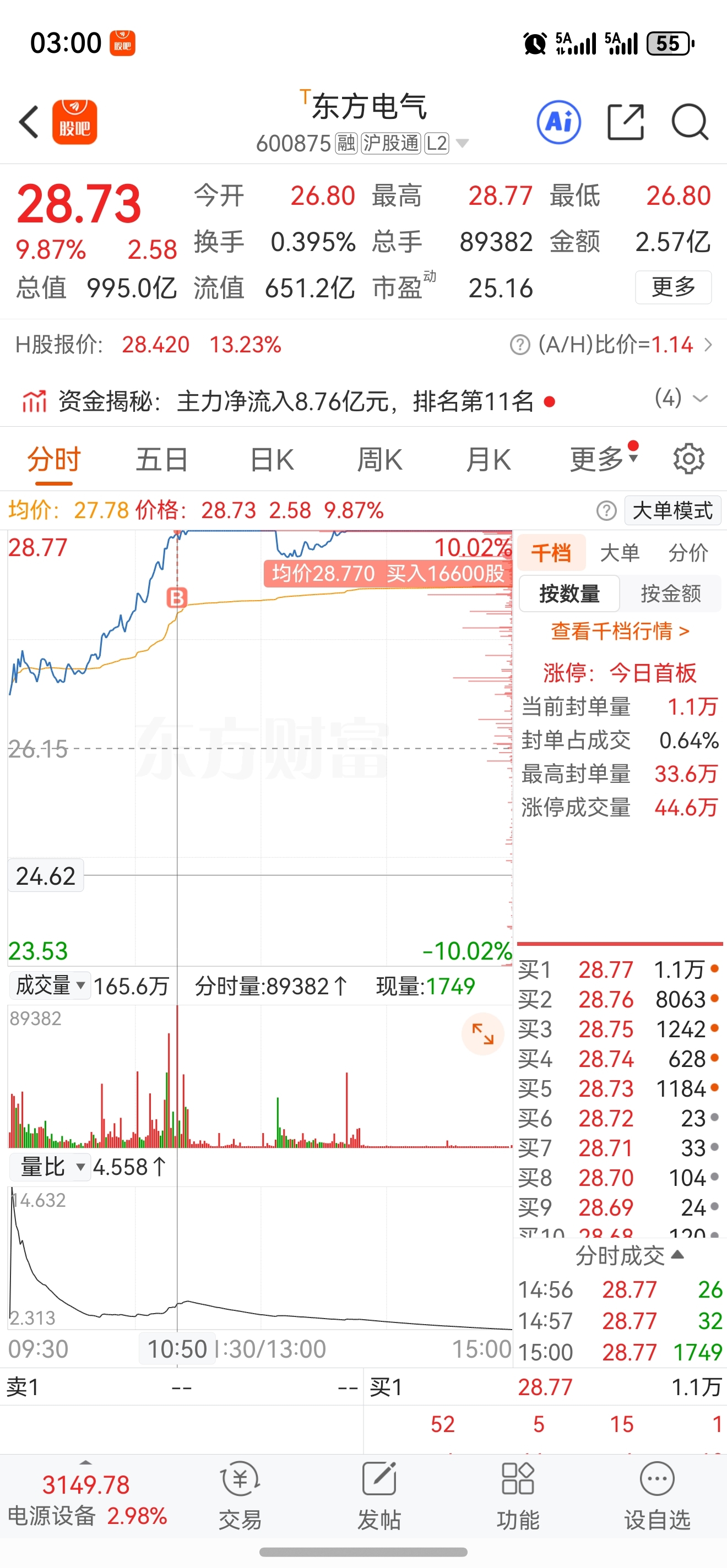 $东方电气(SH600875)$ 上板扫了一笔,位置很好,换手也很好,可以高看一眼