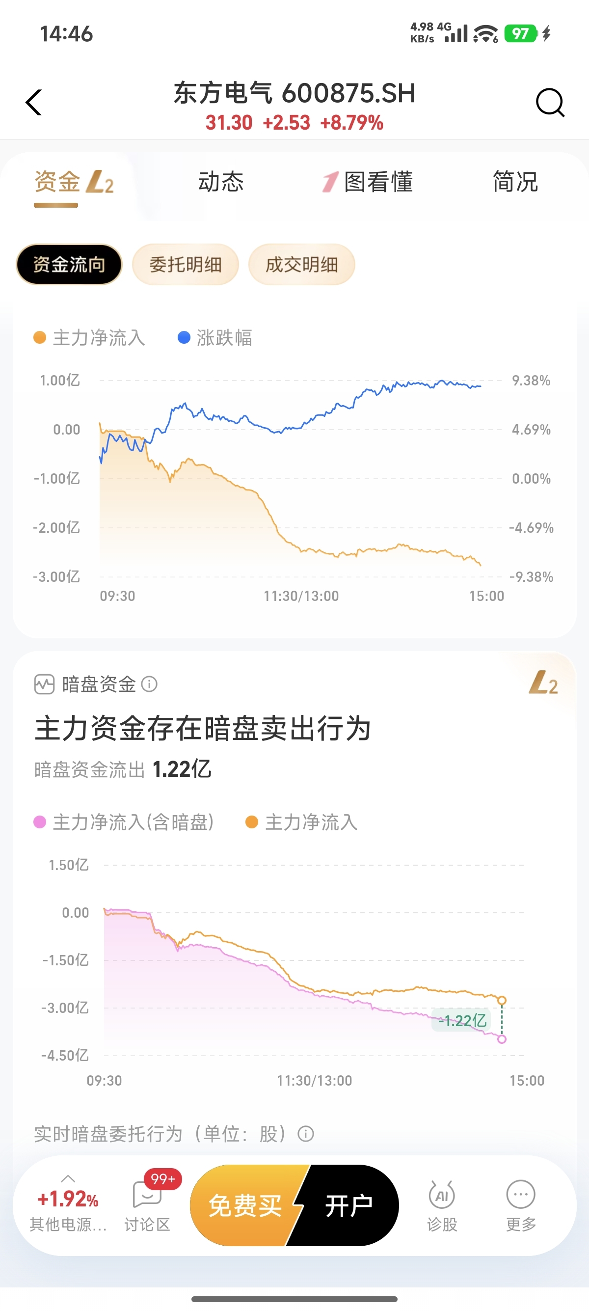 $东方电气(SH600875)$ 暗盘流出这么多,短期注意风险
