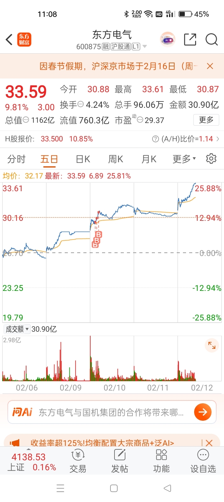 $东方电气(SH600875)$ 涨停吃肉