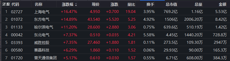 与此同时,港股电力设备板块大涨,截至发稿,上海电气涨超16%,东方电气涨超14%、哈尔滨电气涨超11%。