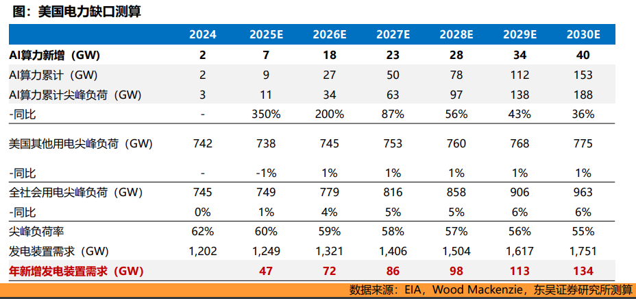 东吴证券表示,AI算力爆发下美国电力供给缺口显著扩大、电源需求大增。我们预测2030年美国累计AI算力将达153GW,对应全社会用电尖峰负荷升至963GW,考虑55%-60%的尖峰负荷率,2030年发电装机需求达1751GW,未来5年年均需新增发电装机100GW。而2026-2030年美国已备案新增装机累计不足200GW,年均仅50GW,仅达需求的50%。叠加美国三大电网互联性差、停电时间长,以及火电持续退役,电力供应的刚性缺口成为行业发展的核心矛盾。