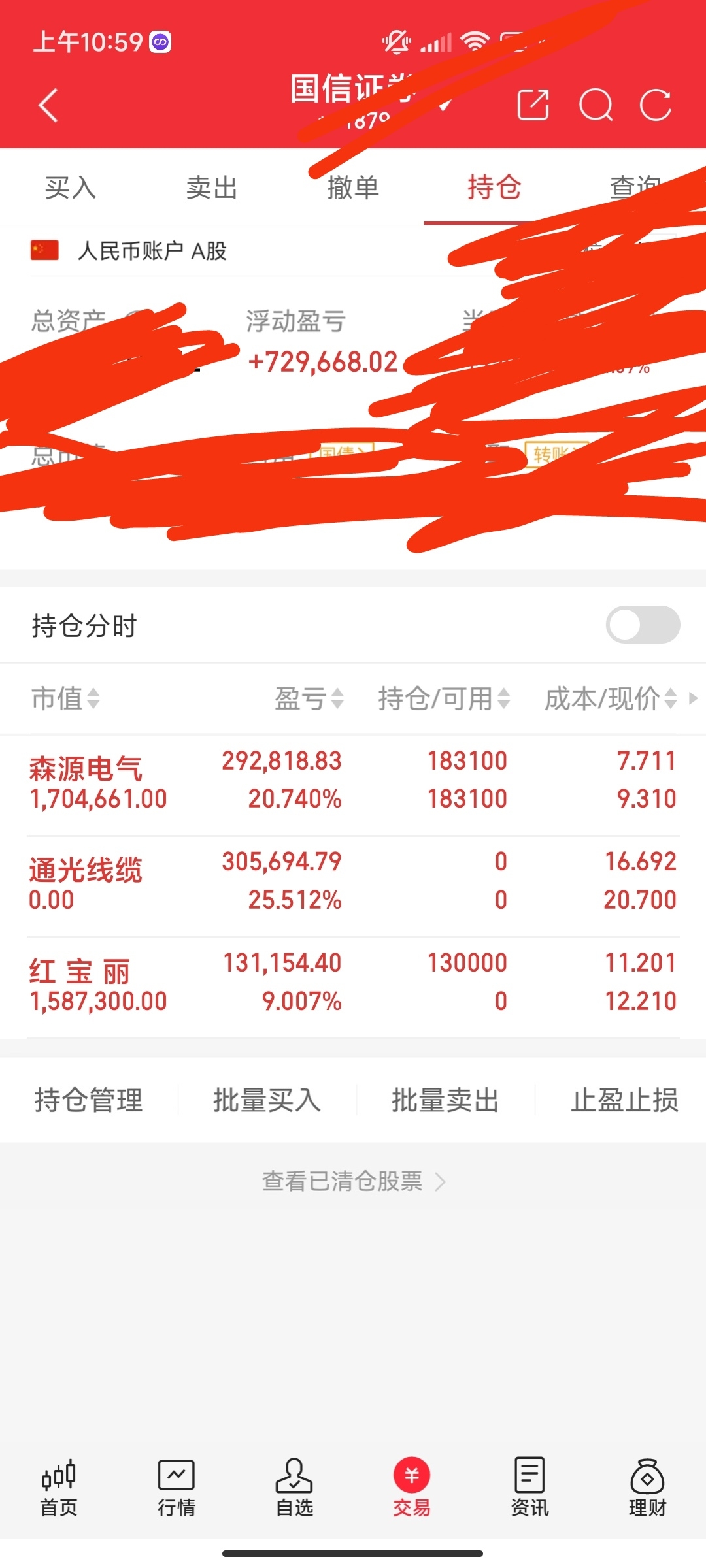 $东方电气(SH600875)$ 大家好,更新一下今日持仓。森源电气继续持有,期待高位目标。将通光线缆止盈出局,落袋30个,非常好。新进了红宝丽,趋势挺好继续加油了!$兆驰股份(SZ002429)$
