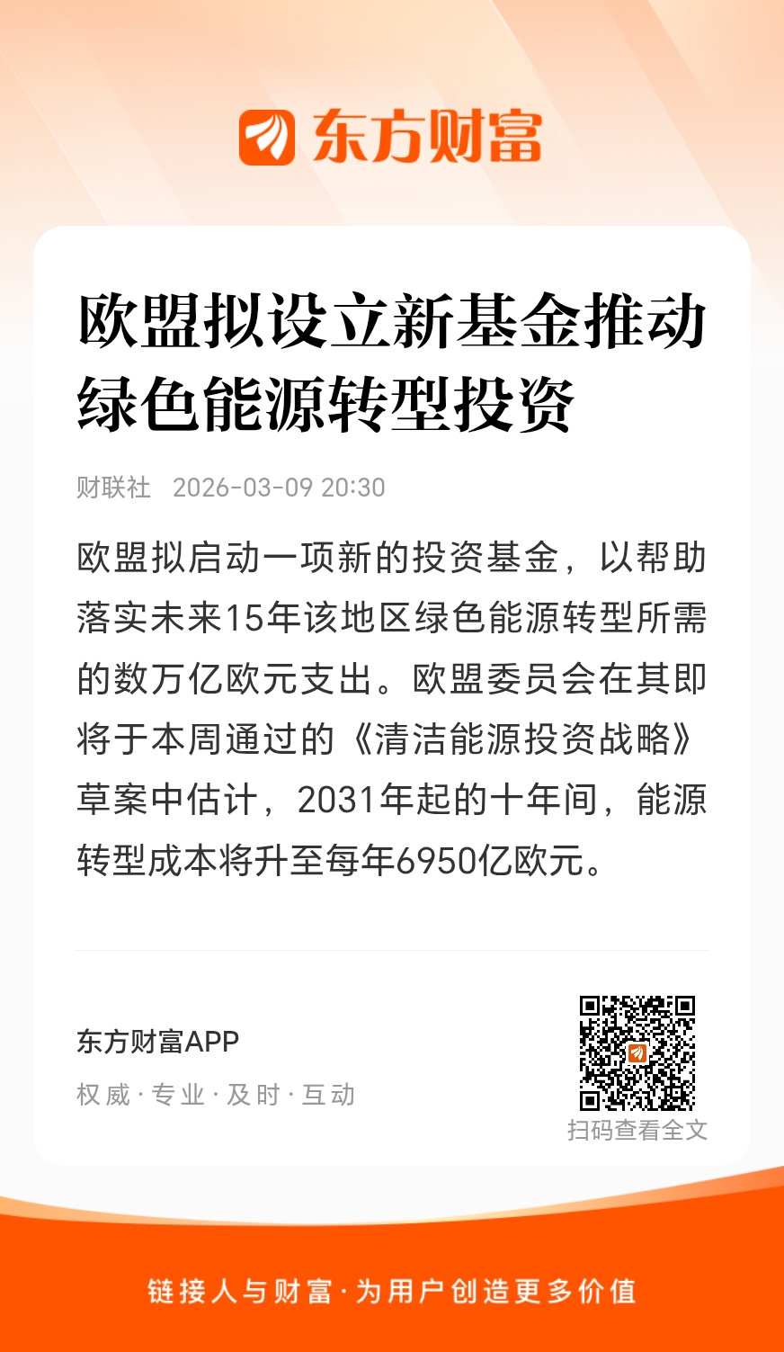 欧盟拟启动一项新的投资基金,以帮助落实未来15年该地区绿色能源转型所需的数万亿欧元支出。欧盟委员会在其即将于本周通过的《清洁能源投资战略》草案中估计,2031年起的十年间,能源转型成本将升至每年6950亿欧元。