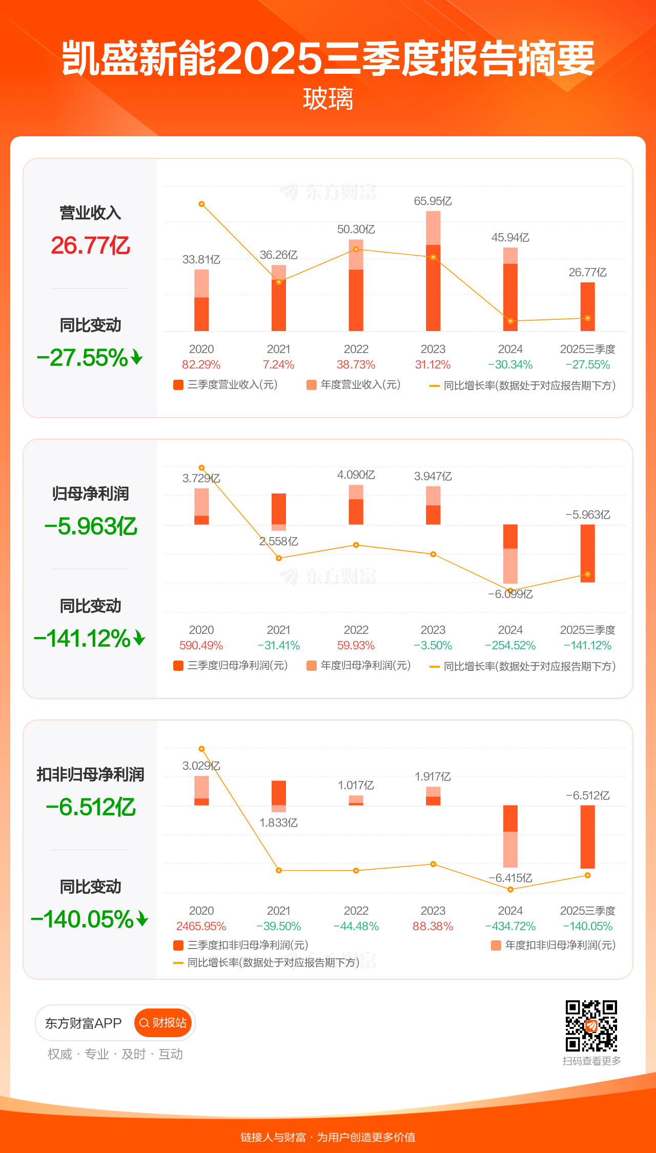 凯盛新能10月31日发布2025年三季报显示,公司前三季实现营业收入26.77亿元,同比下滑27.55%;归母净利润-5.96亿元;扣非归母净利润-6.51亿元。