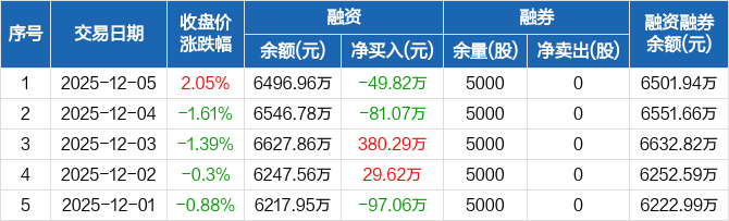 凯盛新能:融资净偿还49.82万元,融资余额6496.96万元(12-05)