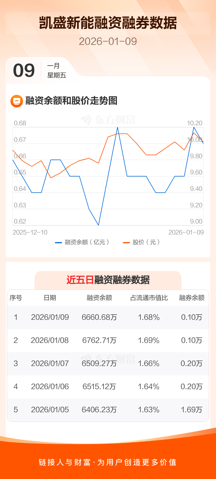 交易所最新数据显示,凯盛新能于2026年1月9日获融资买入285.39万元,融资偿还387.42万元,当日融资净偿还102.03万元。目前,该股融资余额6660.68万,占流通市值比例为1.68%。