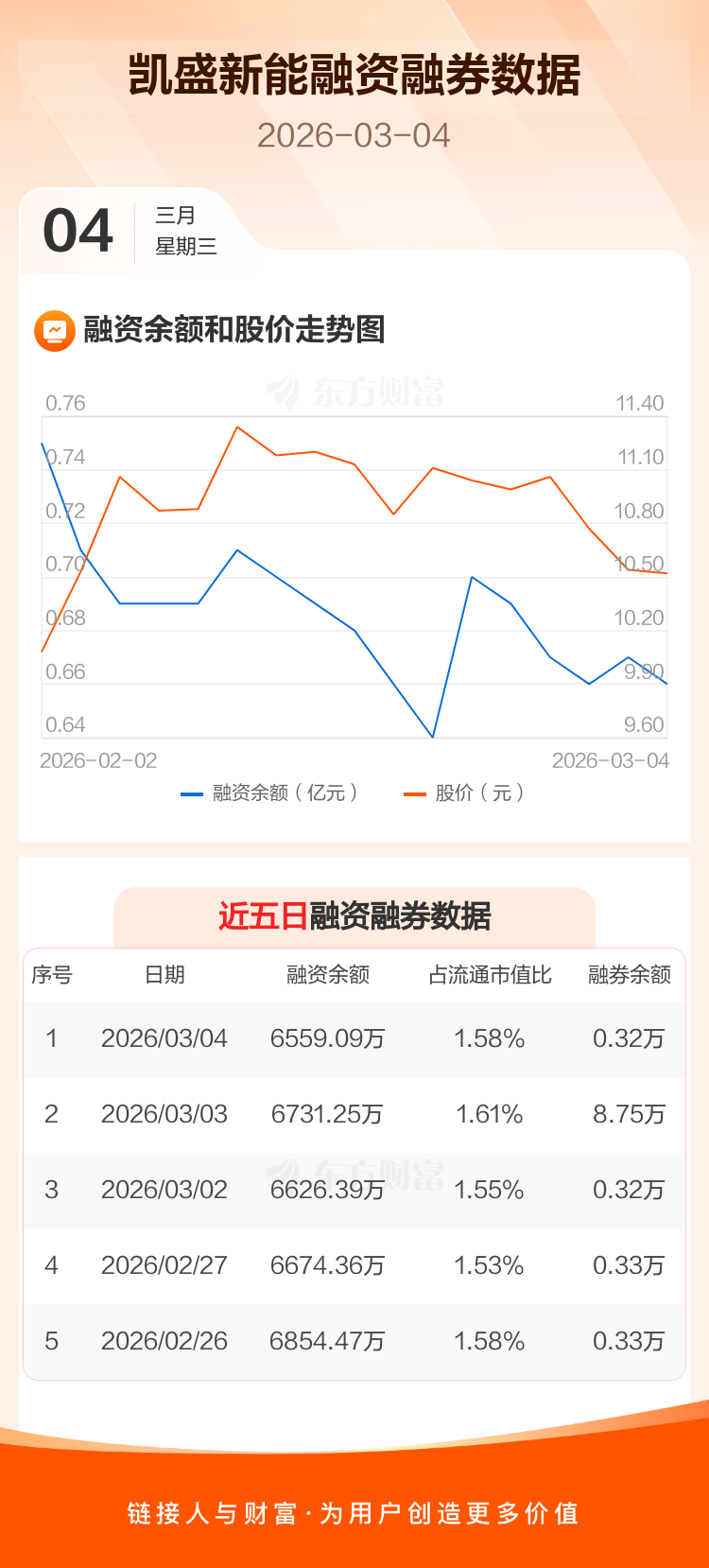交易所最新数据显示,凯盛新能于2026年3月4日获融资买入397.92万元,融资偿还570.08万元,当日融资净偿还172.16万元。目前,该股融资余额6559.09万,占流通市值比例为1.58%。