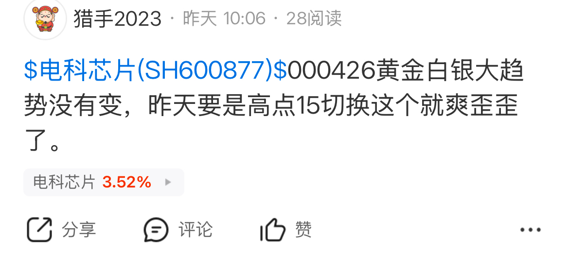 $电科芯片(SH600877)$ 机台银板块大涨,运气太好了。可惜没多买,就在电科里面养老了。