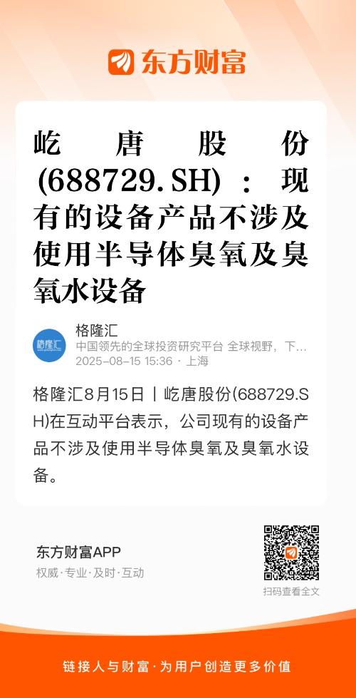 格隆汇8月15日丨屹唐股份(688729.SH)在互动平台表示,公司现有的设备产品不涉及使用半导体臭氧及臭氧水设备。