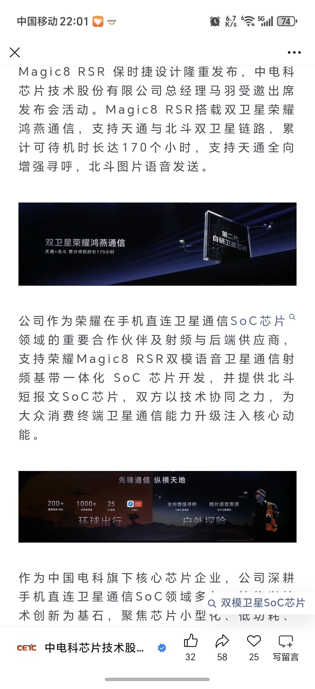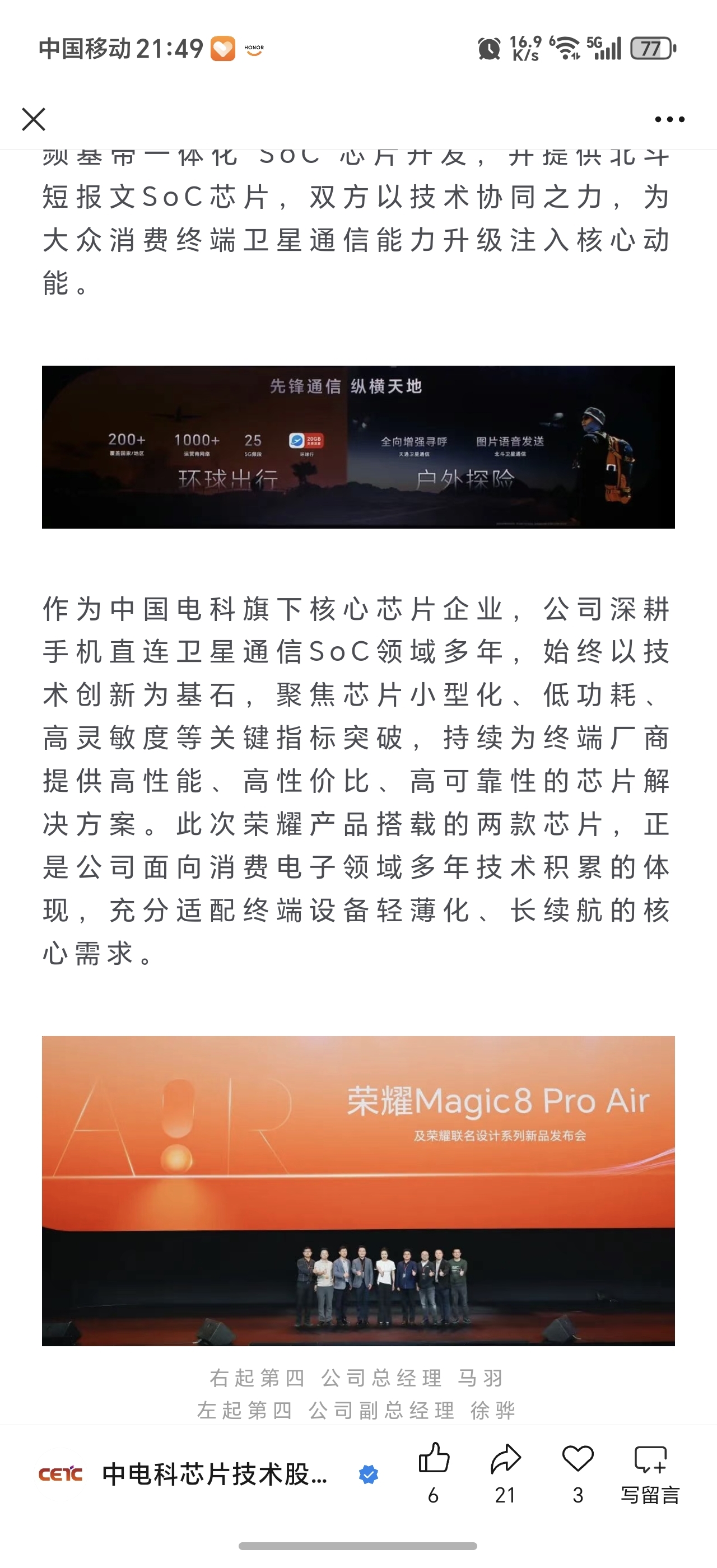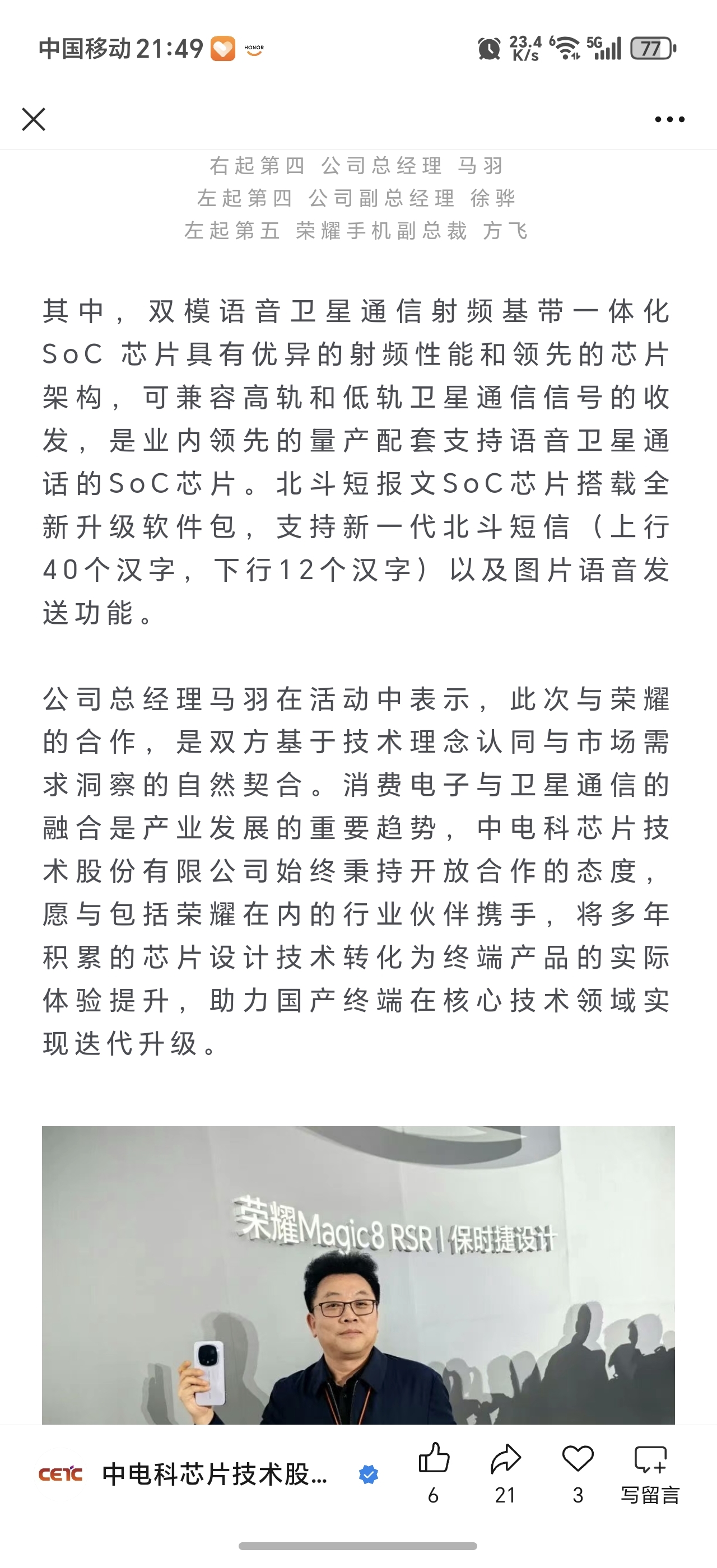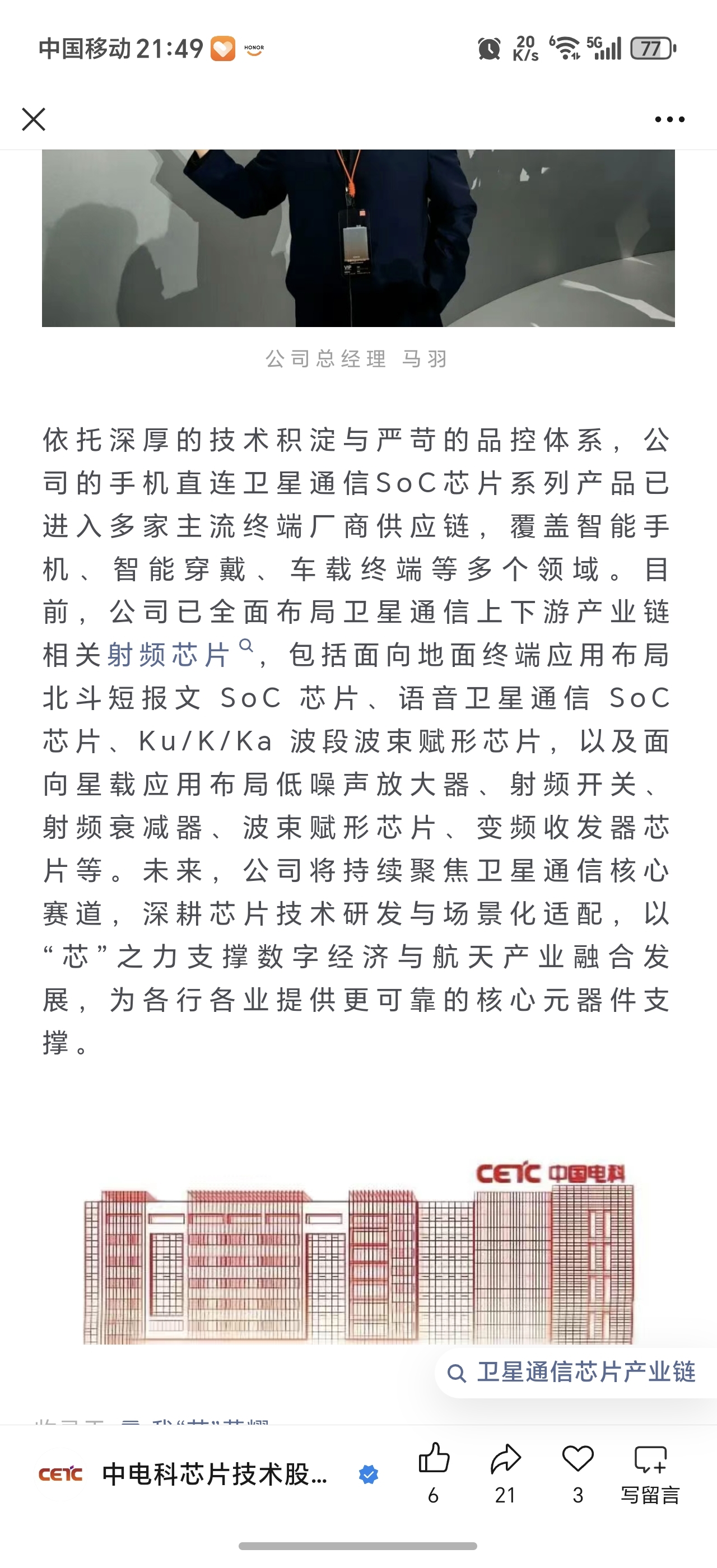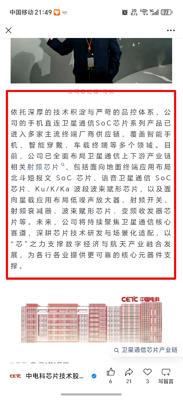 $电科芯片(SH600877)$ $海格通信(SZ002465)$ $臻镭科技(SH688270)$ 今天电科芯片微信公众号宣布为荣耀提供手机直连低轨卫星芯片,公司深度布局了终端用的手机宽/窄直连带低轨卫星芯片、星载毫米波波束赋形芯片等多种产品,未来的星辰大海电科芯片绝对是在卫星互联网上的超级赛道股!