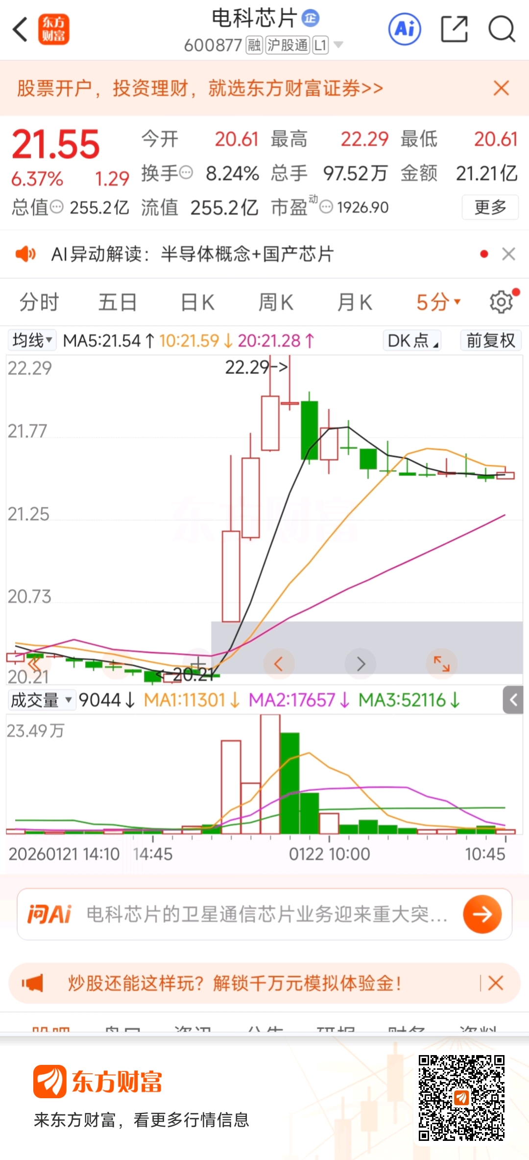电科的五分k线十字星非常密集,大佬们怎么看$电科芯片(SH600877)$