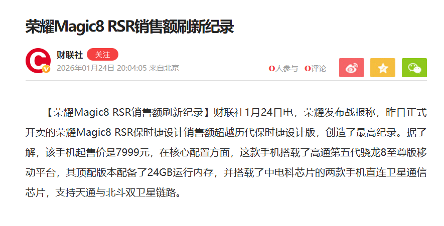 【荣耀Magic8RSR销售额刷新纪录】