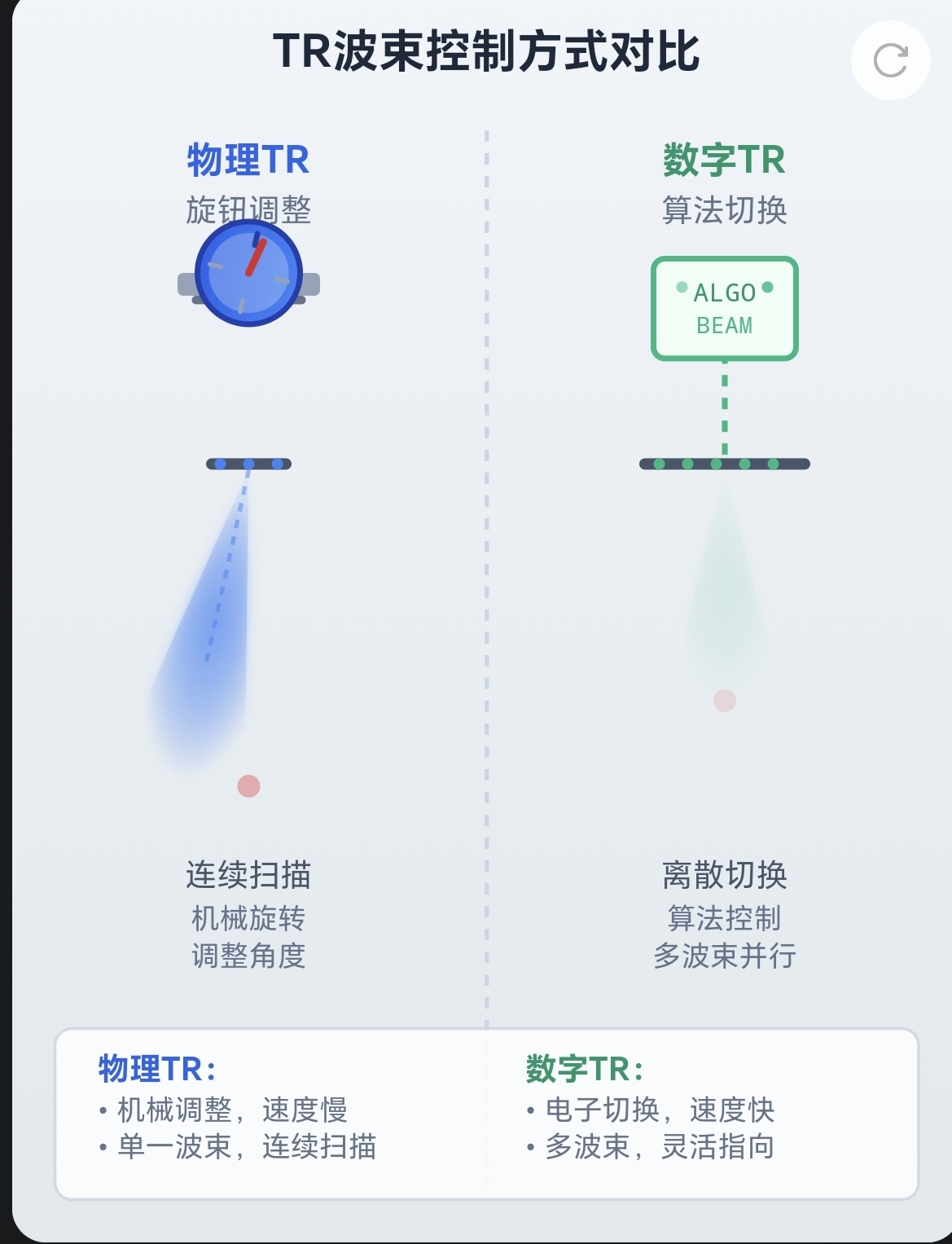 模拟TR用“物理旋钮”调波束,数字TR用“算法开关”调波束——就像收音机旋钮和调频APP的区别。